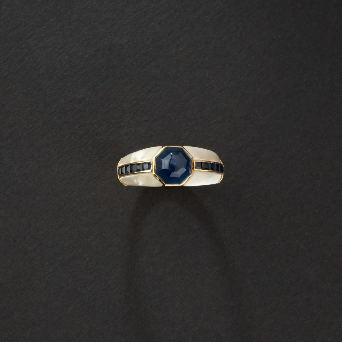 Bague REPOSSI pour femmes en or jaune 18K, saphirs et nacres. Bague jonc en or jaune 750 millièmes centrée d’un saphir octogonal suiffé épaulé de plaques de nacre blanche et saphirs calibrés. Travail italien.