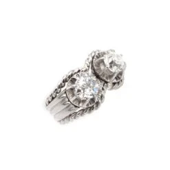 Bague Toi & Moi en platine et centrée de deux diamants taille ancienne. Diamants encadrés d’un motif torsadé. L’anneau est orné de trois ciselures.