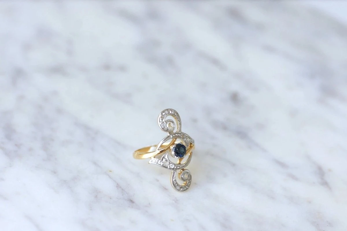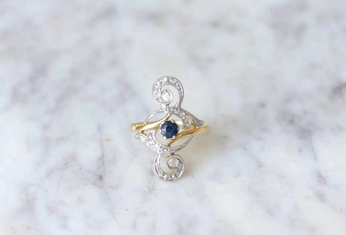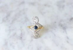 On aime le charme des volutes mêlée à l’élégance des diamants et des saphirs sur cette belle bague ancienne.