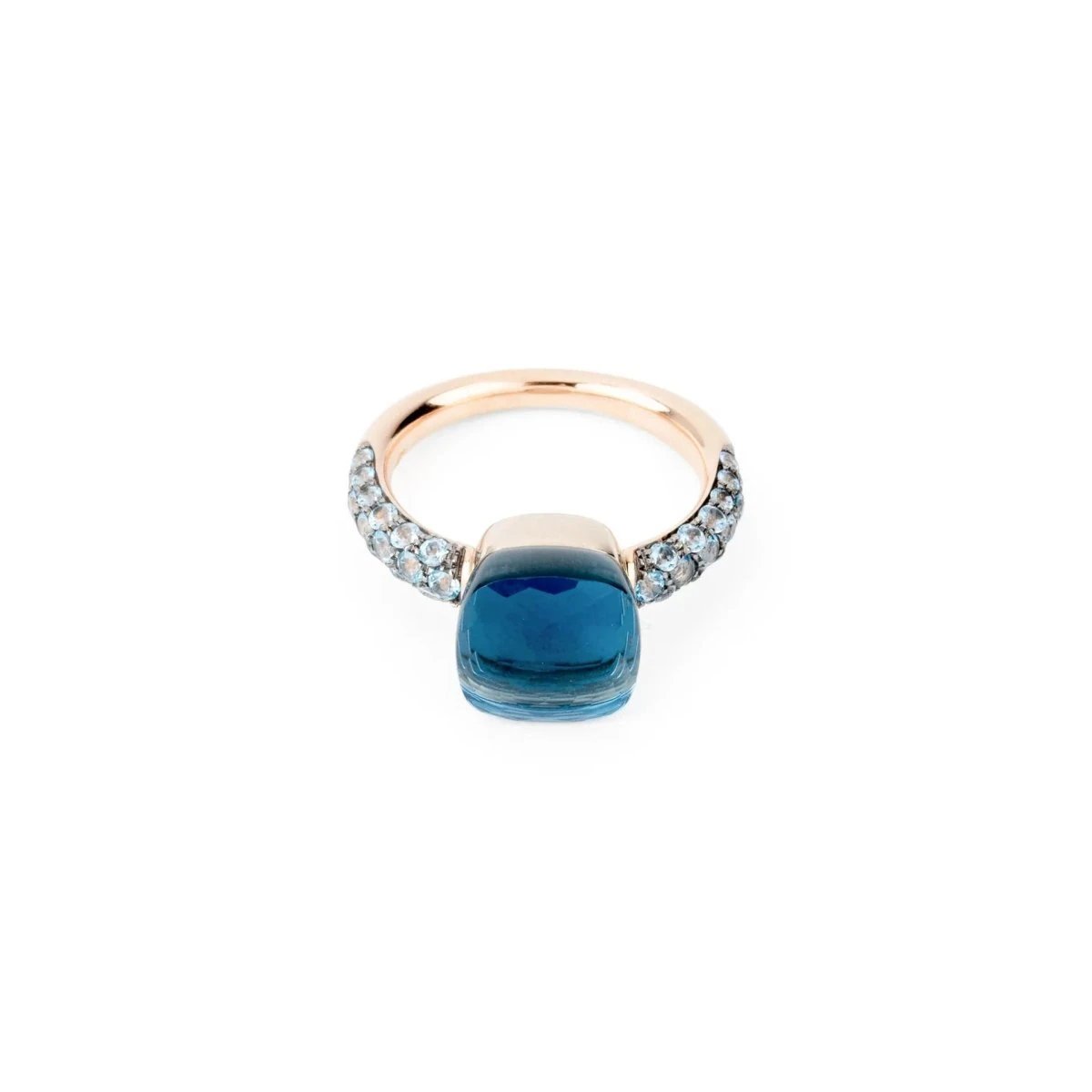 Bague de la maison Pomellato modèle Nudo en or rose et topazes bleues au centre et sur les cotés.