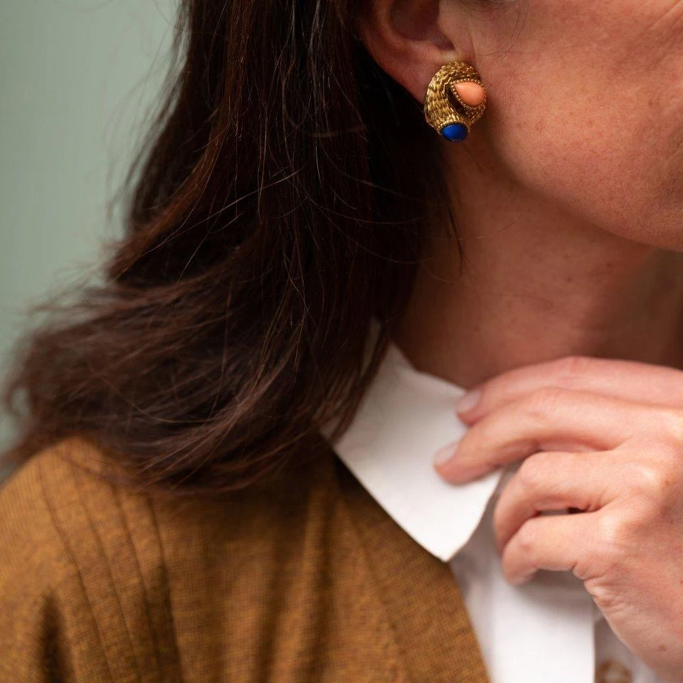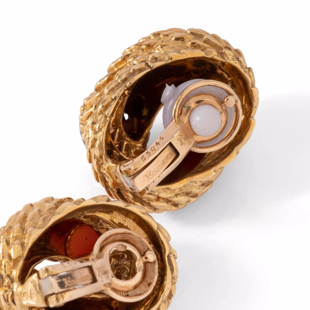 Boucles d’oreilles Clips de la Maison BOUCHERON « Serpent Bohème », en or jaune 18 carats, cabochon de corail et lapis lazuli.