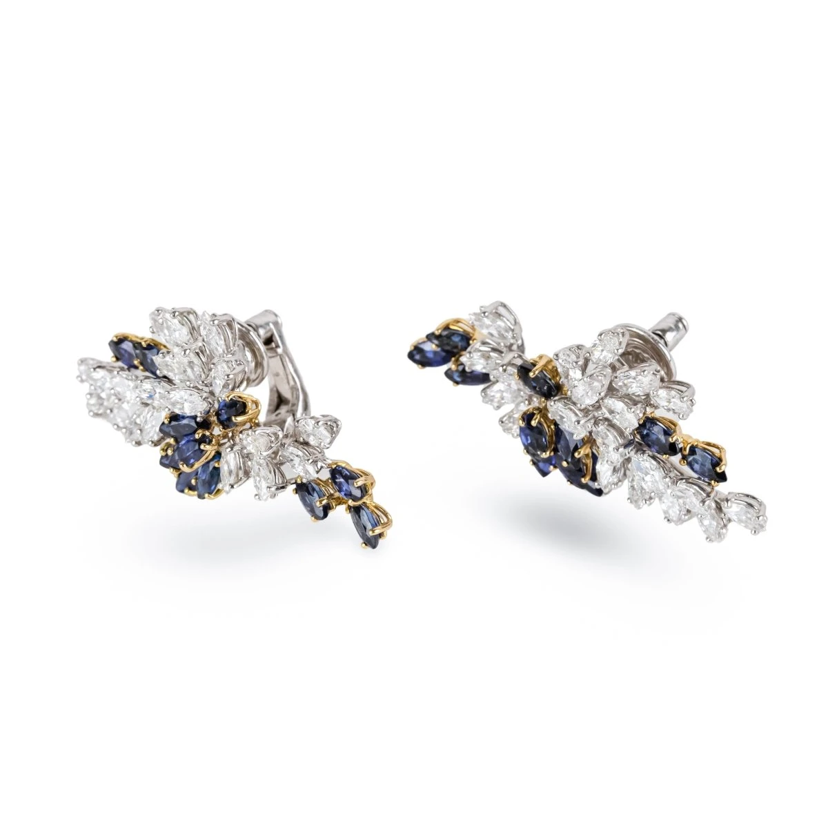 Boucles d’oreilles Clip CHAUMET en or blanc et or jaune 18 carats, platine serties de diamants navette et saphirs.