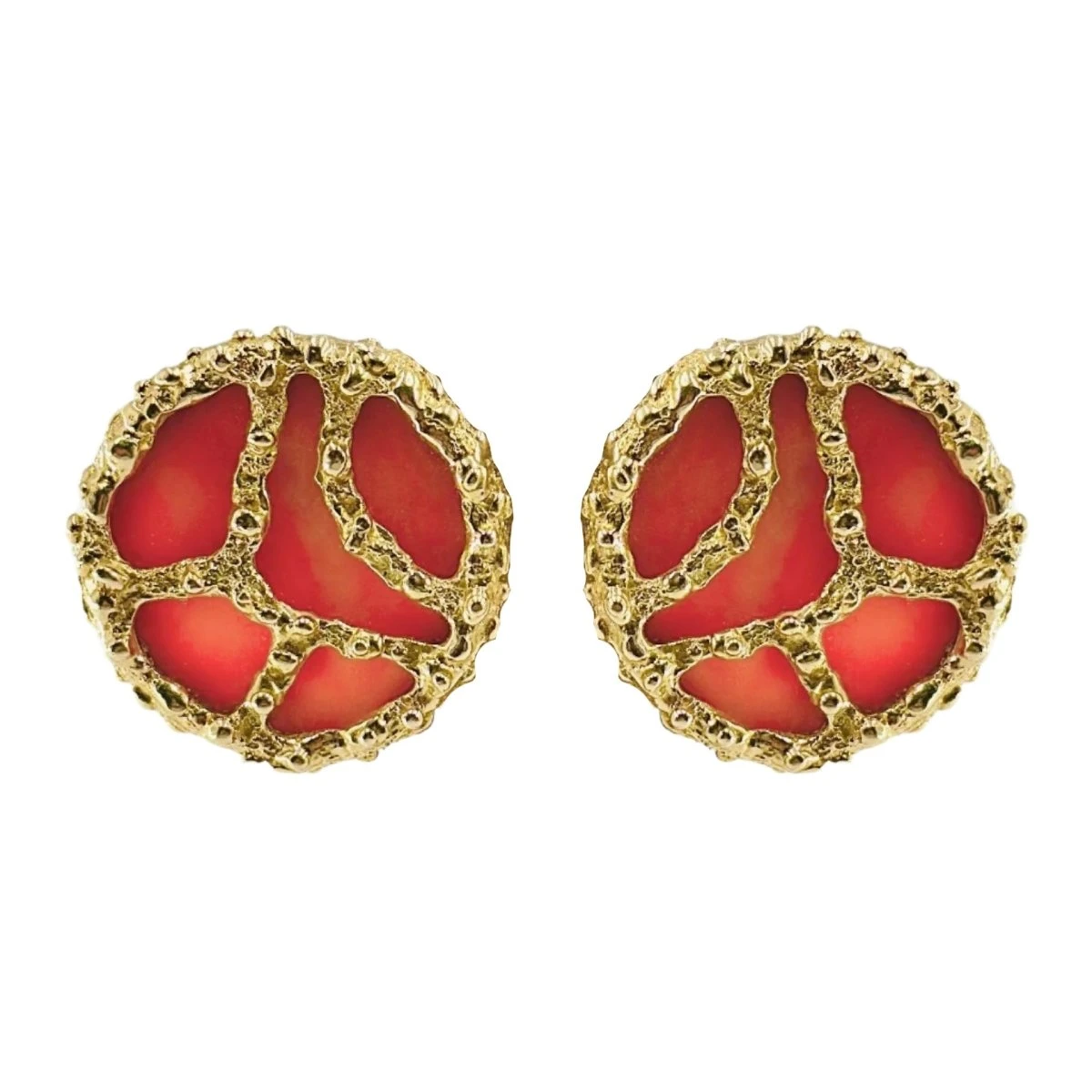 Boucles d’oreilles MAUBOUSSIN rondes en or jaune texturé et granité 18 carats et entourant des disques de corail. Système à clip.