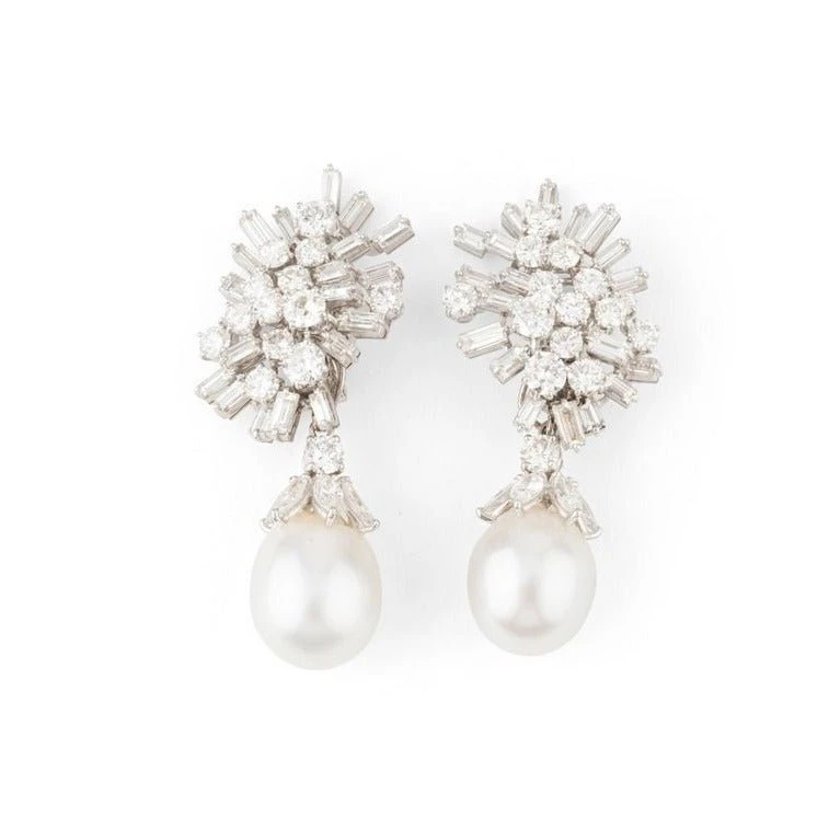 Boucles d’oreilles Clips en forme, toutes serties de diamants taille baguettes et taille brillants avec perle goutte rehaussée de diamants taille marquise, monté sur platine. La perle est amovible.
