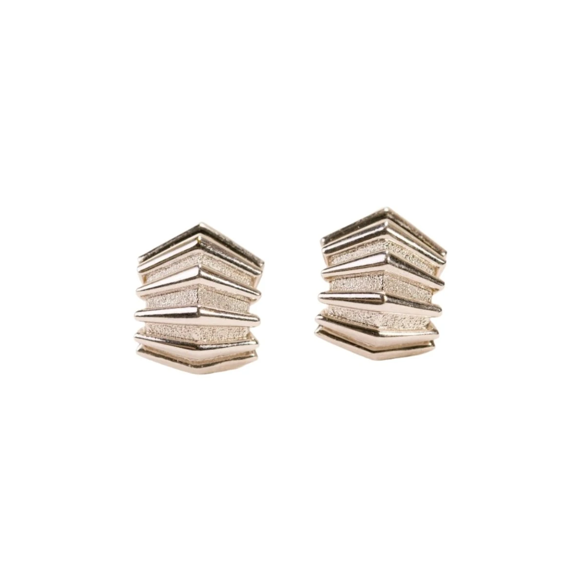 Boucles d’oreilles en or blanc 750/1000 (18K) avec des détails d’or poli et d’or granité tout en volumes geométriques.