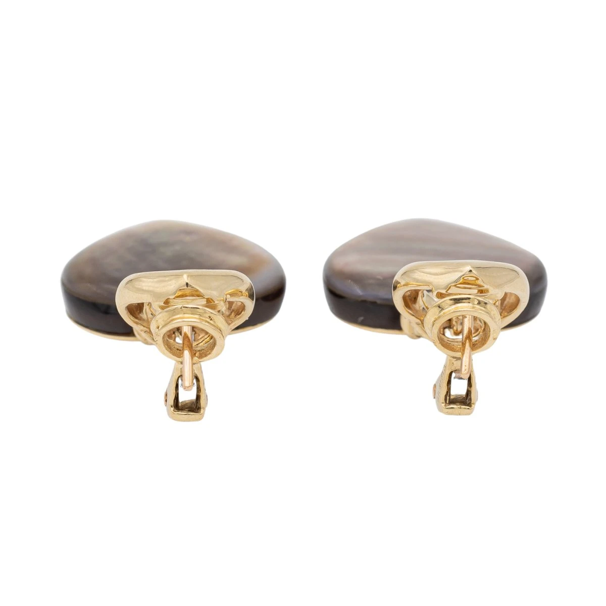 Paire de boucles d’oreilles cœurs en or jaune 750 millièmes (18 carats). serties de nacre grise. dimensions: 3.42 cm x 1.89 cm. poids total: 13.44 g. excellent état