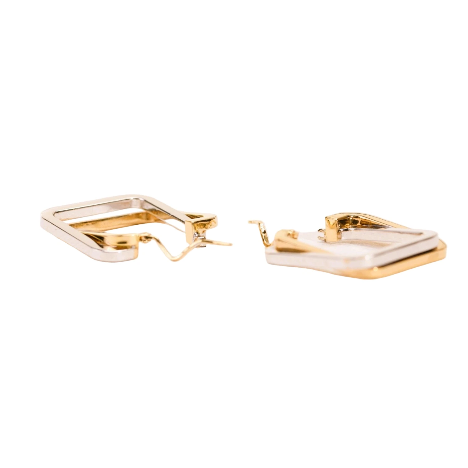 Paire de boucles d’oreilles créoles contemporaines en or poli de deux tons 750/1000 (18K / Poinçon Hibou) formant des carrés qui se chevauchent.