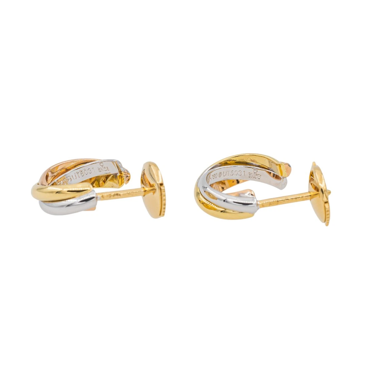 Boucles d’oreilles Cartier 3 ors 750 millièmes (18 carats) . modèle Trinity. numéroté. diamètre intérieur 1 cm. poids total: 4.38 grammes. excellent état.