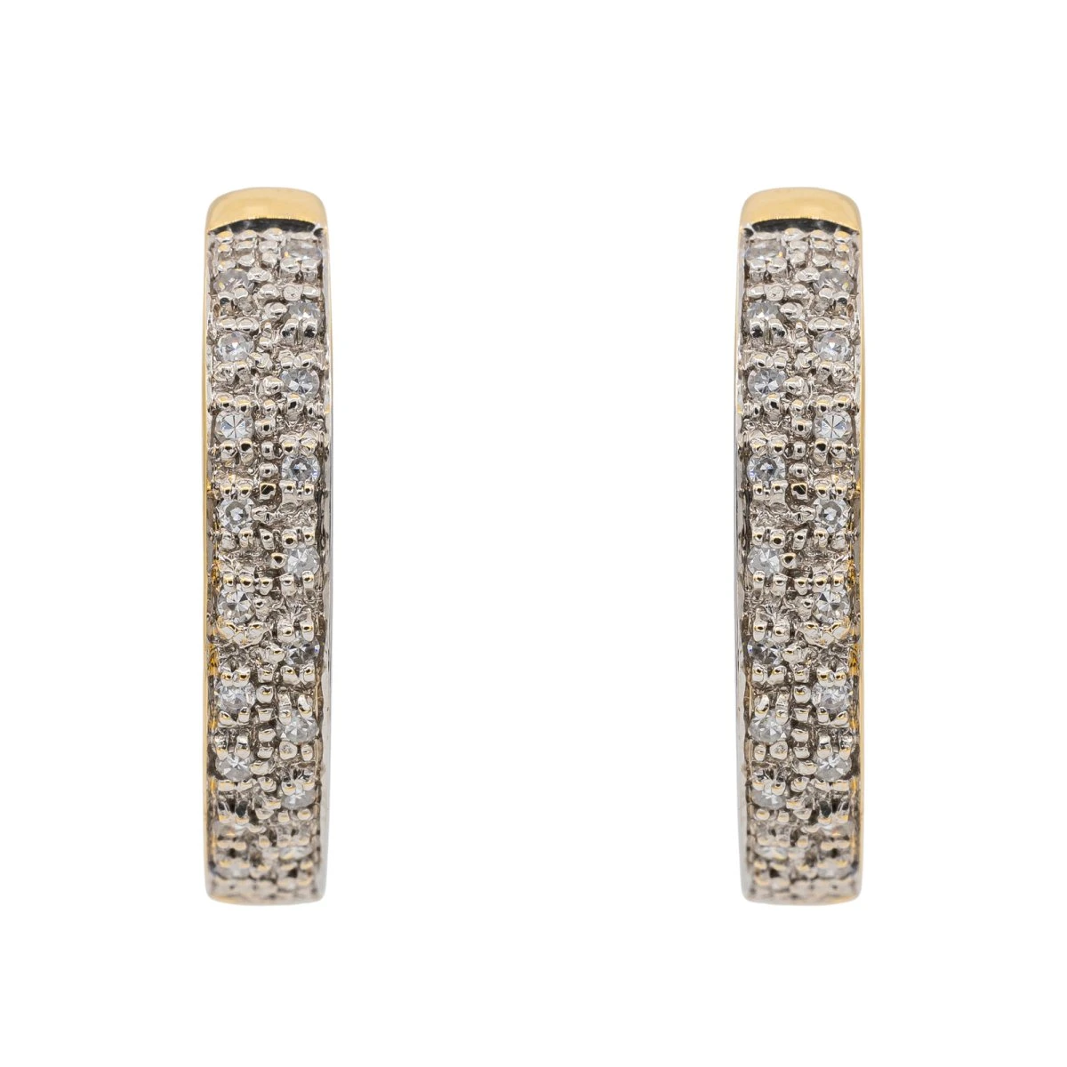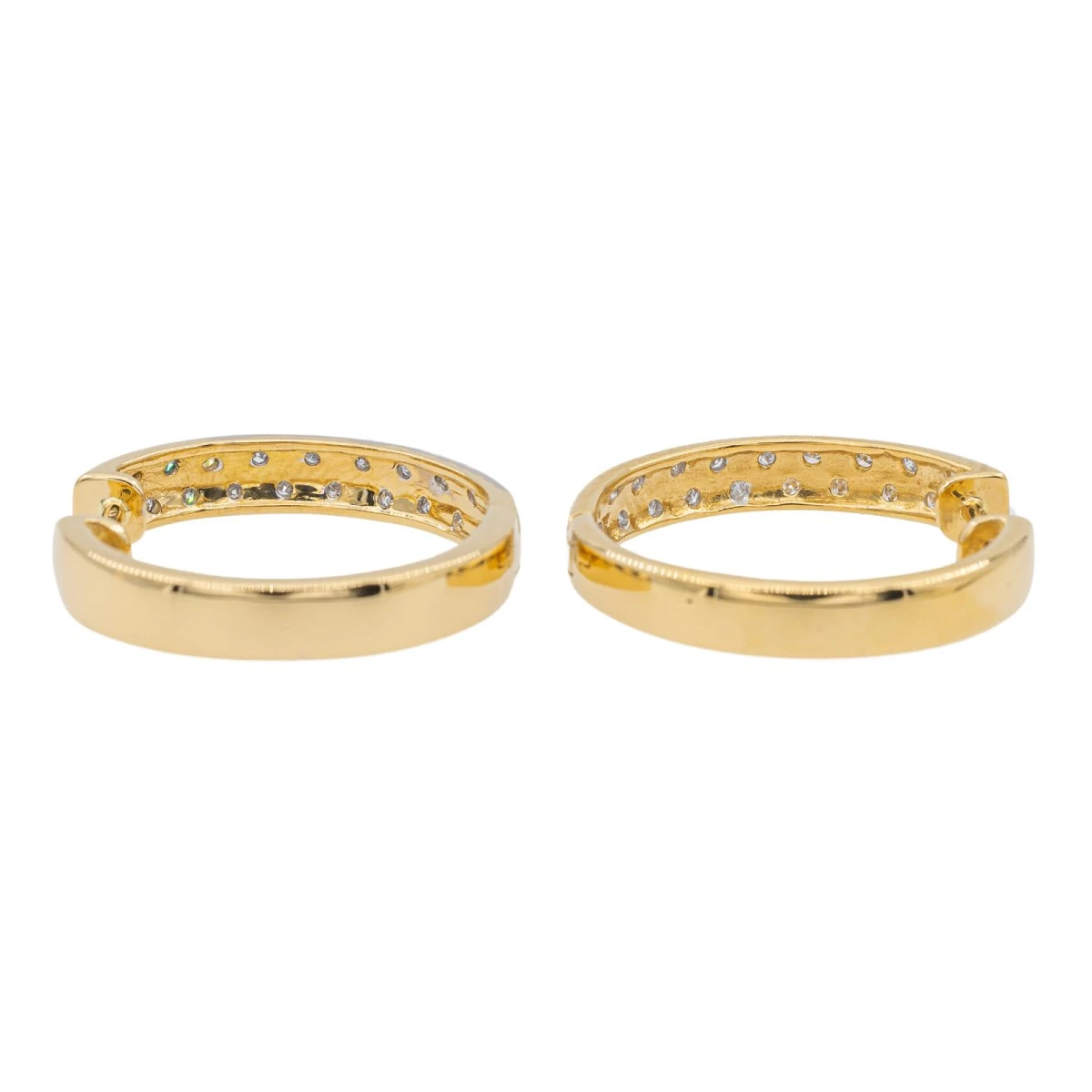 Créoles en or jaune 750 millièmes (18 carats) serties de 40 diamants taille brillant. d’environ 0.01 ct chacun. poids total diamants : environ 0.40 ct diamètre : 2.02 cm. largeur : 3.50 cm. poids total : 6.53 g. poinçon hibou. excellent état