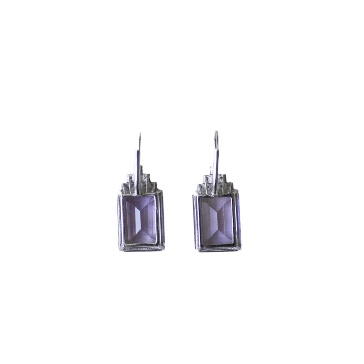 Boucles d’oreilles dormeuses en or blanc 18 carats, ornées de belles améthystes rectangulaires à pans coupés, surplombées de diamants taillés en brillant. Travail moderne style Art Déco.