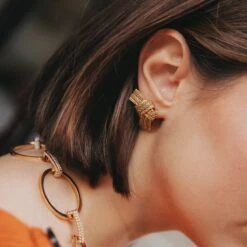 Boucles d’oreilles KORLOFF en or blanc 750‰, serties d’un pavage de petits diamants « taille brillant ». Interchangeables, la partie pendante peut être retirée pour qu »elles deviennent des puces d’oreilles, un jeux de mix & match typique de la maison.