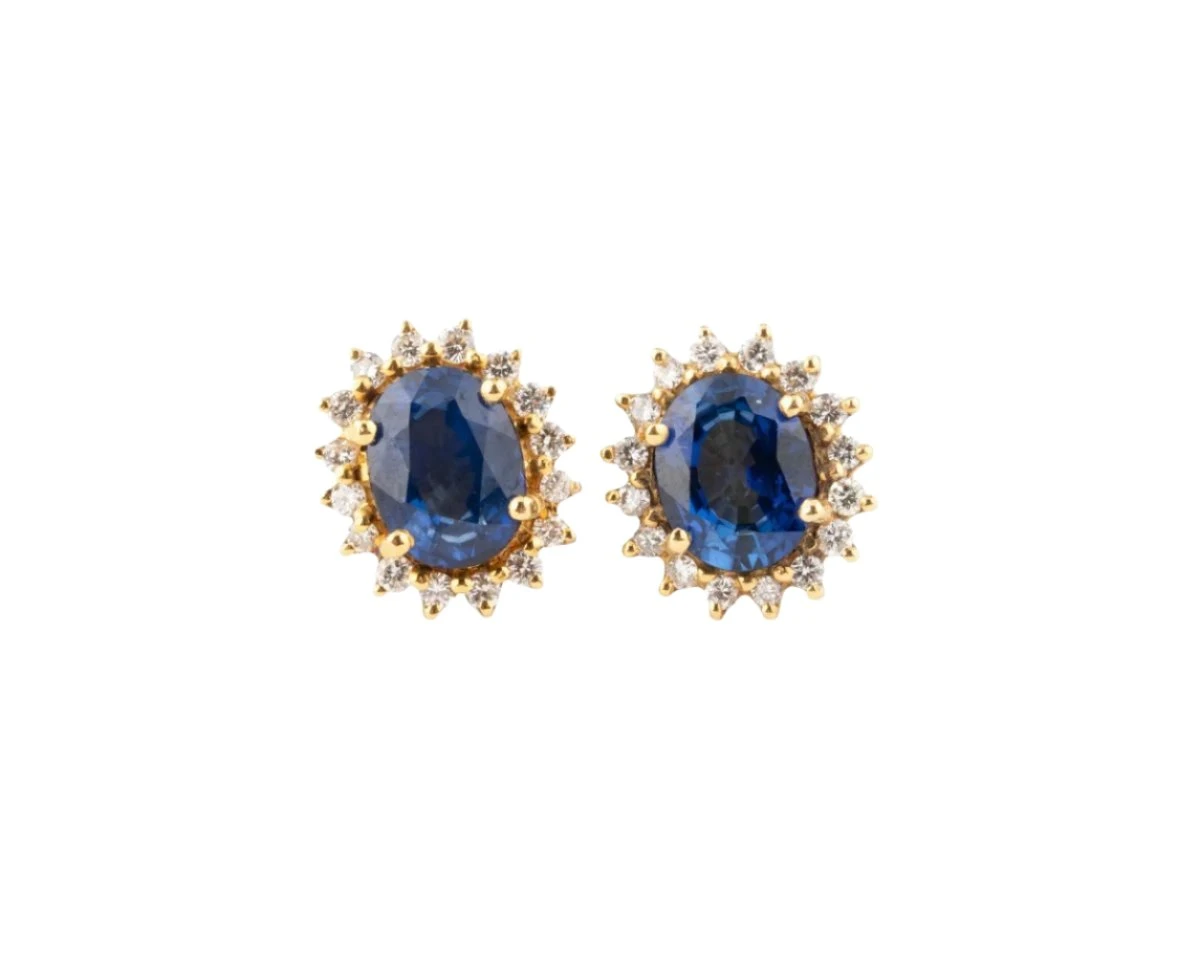 Boucles d’oreilles Marguerite en or jaune 18 carats ornée d’un saphir central dans un entourage de diamants taille brillant.