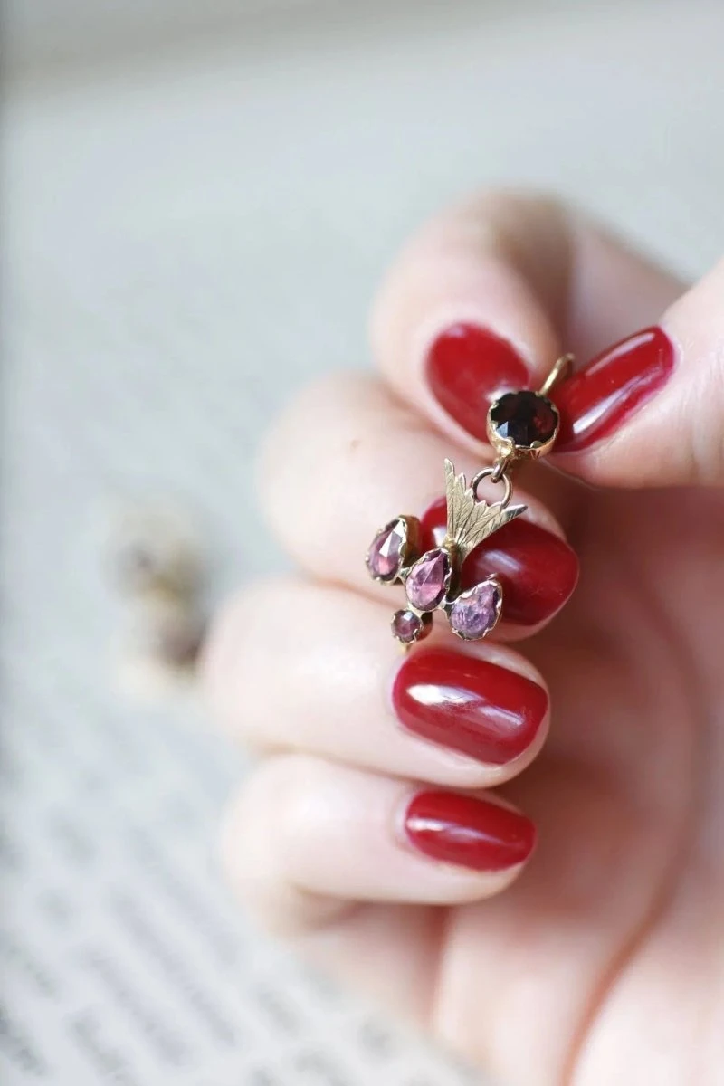 Boucles d’oreilles pendantes en or rose 18kt (poinçon: tête d’aigle) ornées d’une pendeloque représentant une colombe, le tout serti de grenats de Perpignan montées sur paillon.