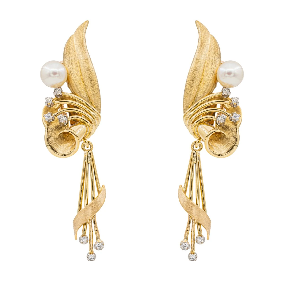 Boucles D’oreilles Pendantes En Or Jaune, Perle De Culture Et Diamant