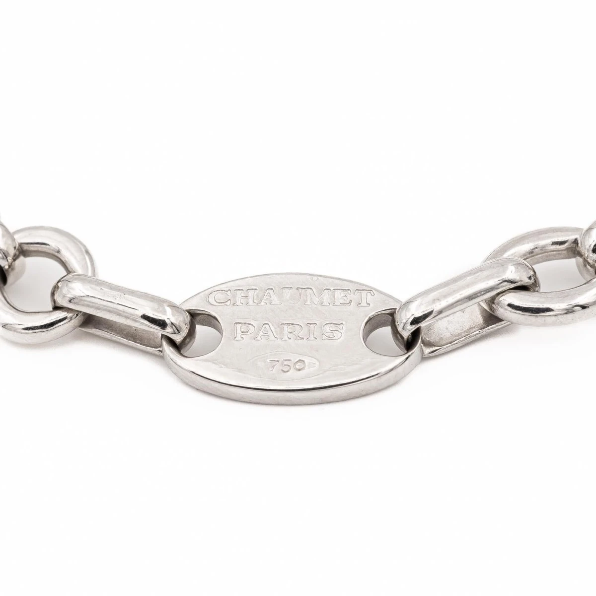 Bracelet signé Chaumet en or blanc 750 millièmes (18 carats). maille souple. longueur: 19 cm. largeur: 0.63 cm. poids total: 18.37 g. fermoir mousqueton. poinçon tête d’aigle. excellent état