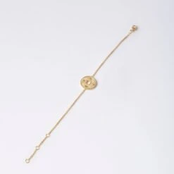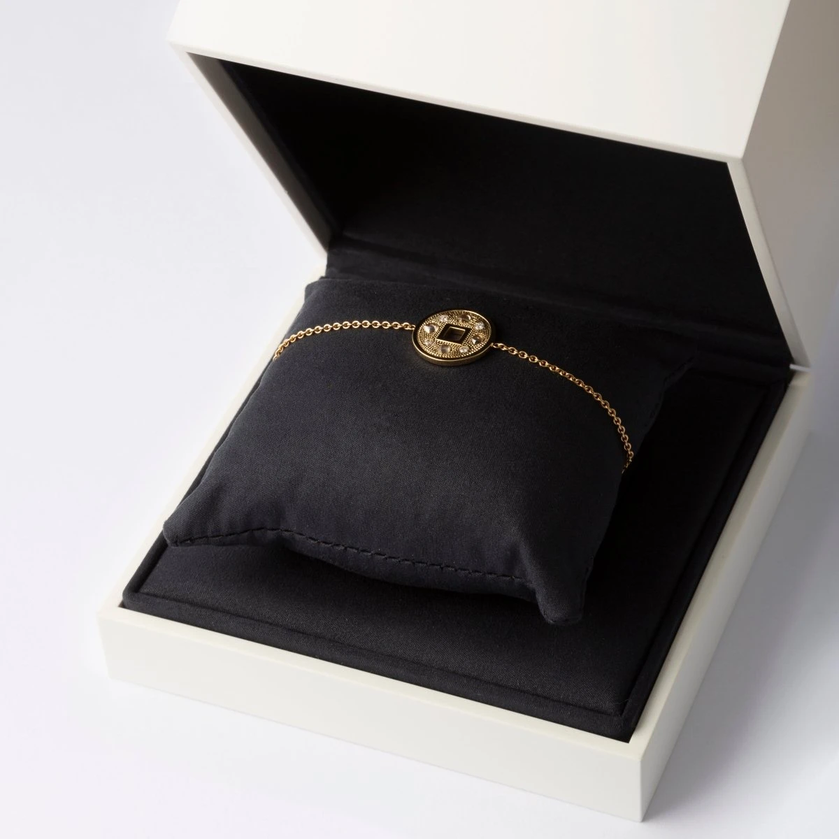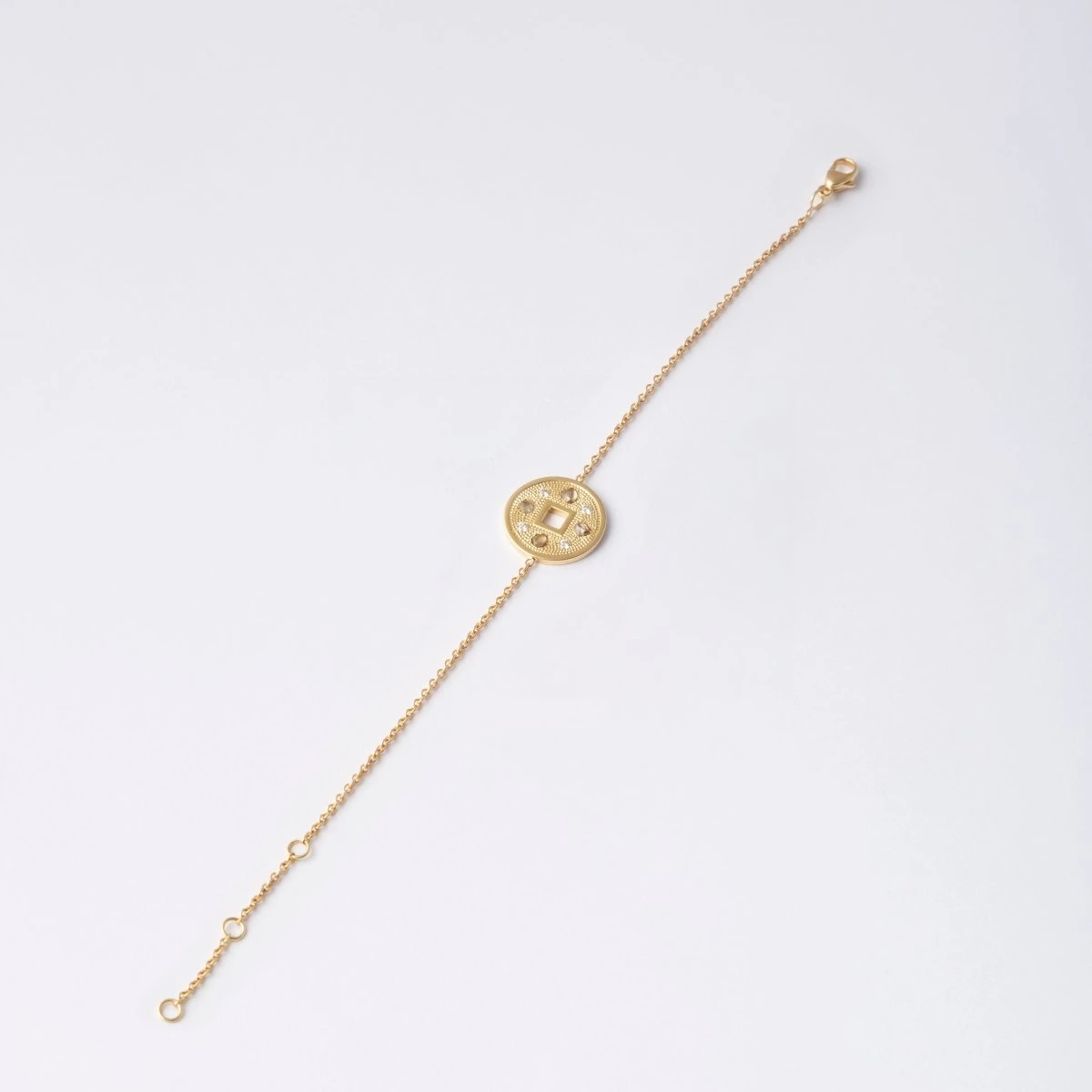 Bracelet DE BEERS modèle « talisman » en or jaune 18 carats, le médaillon ajouré d’un motif carré au centre, est orné de petits diamants. Trois anneaux permettent d’ajuster la taille du bracelet.
