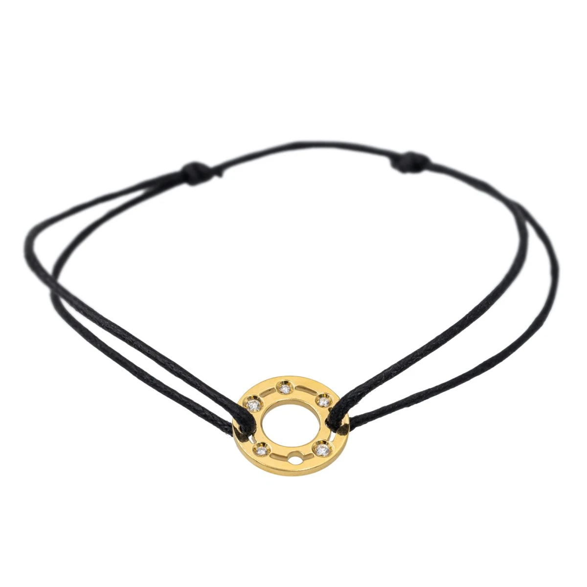Bracelet cordon Dinh Van or jaune 750 millièmes (18 carats). modèle pulse. sertie de 5 diamants taille brillant. d’un poids total d’environ 0.05 ct. (chaque diamant d’un poids d’environ 0.01 ct) longueur: 17 cm. largeur: 1.3 cm. épaisseur: 0.12 cm. taille ajustable grâce aux noeuds coulissants du cordon. poids total : 1.68g. excellent état