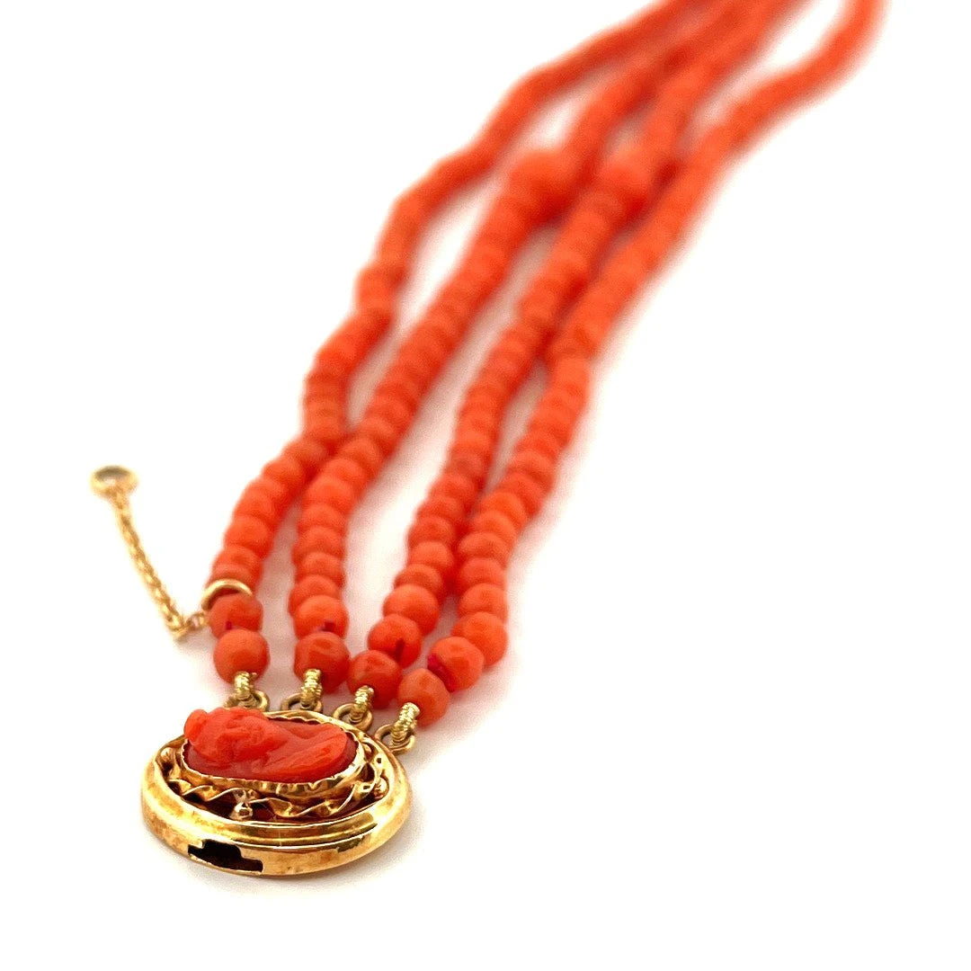 Bracelet quatre rangs de perles de corail figurant une tête de femme sculptée dans un entourage en or jaune 18 carats.