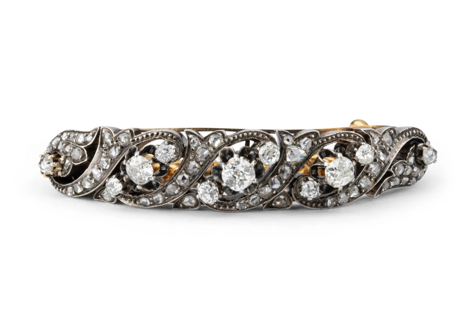 Bracelet Gourmette en or jaune 750/1000 (18k) et argent avec un motif mouvementé de diamants.