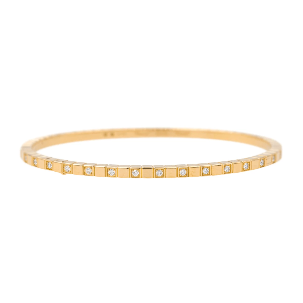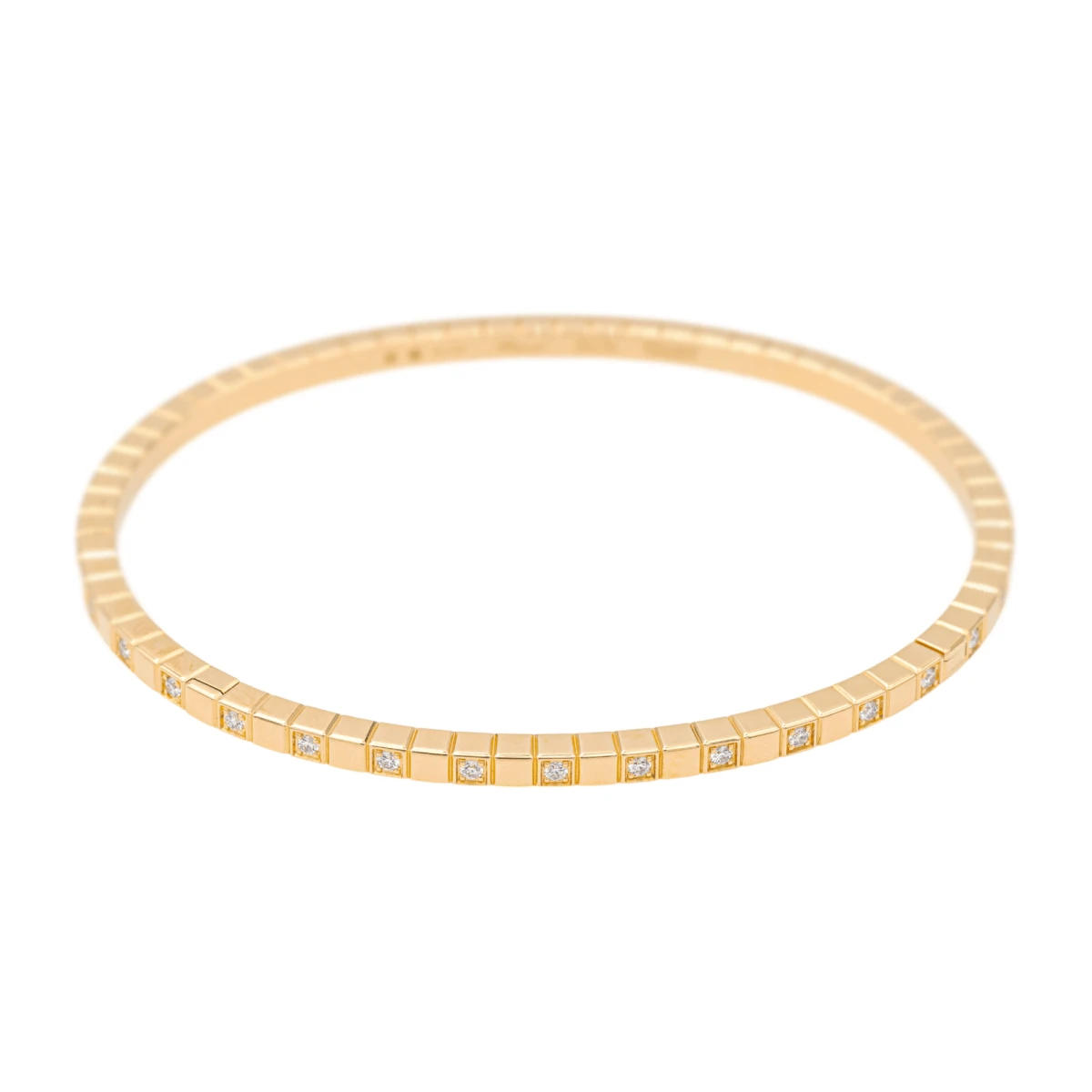Bracelet signé de la Maison Chopard. collection Ice Cube. en or jaune 750 millièmes (18 carats). jonc ouvrant. semi serti. 34 diamants. taille brillant. pour environ 0.33 ct. taille : 16 cm. largeur : 0.28 cm. poids total : 14.10 g. numéroté. poinçon saint bernard. full set. excellent état. jamais porté