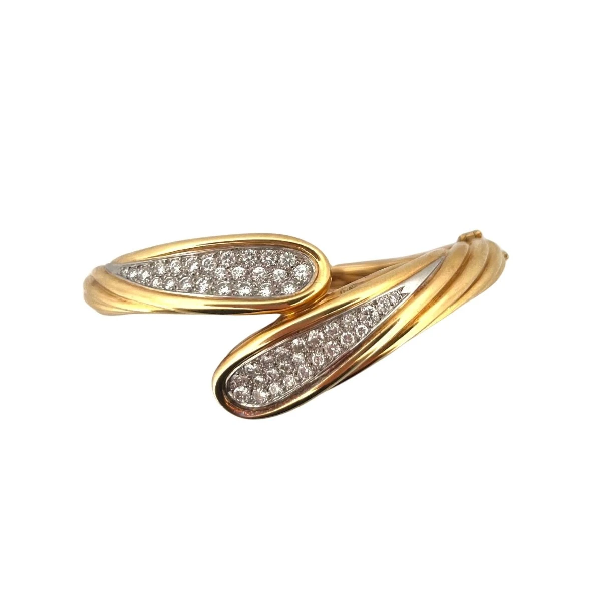 Bracelet jonc torsadé MAUBOUSSIN en or jaune 18 carats et platine, avec ses extrémités pavées de diamants. Circa 1990.