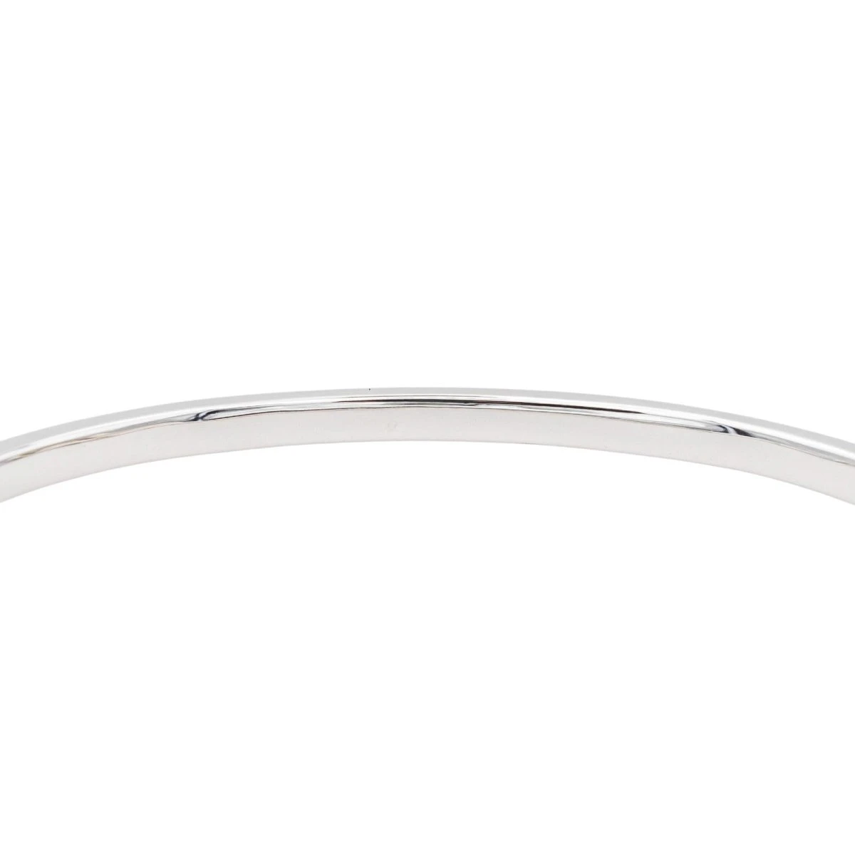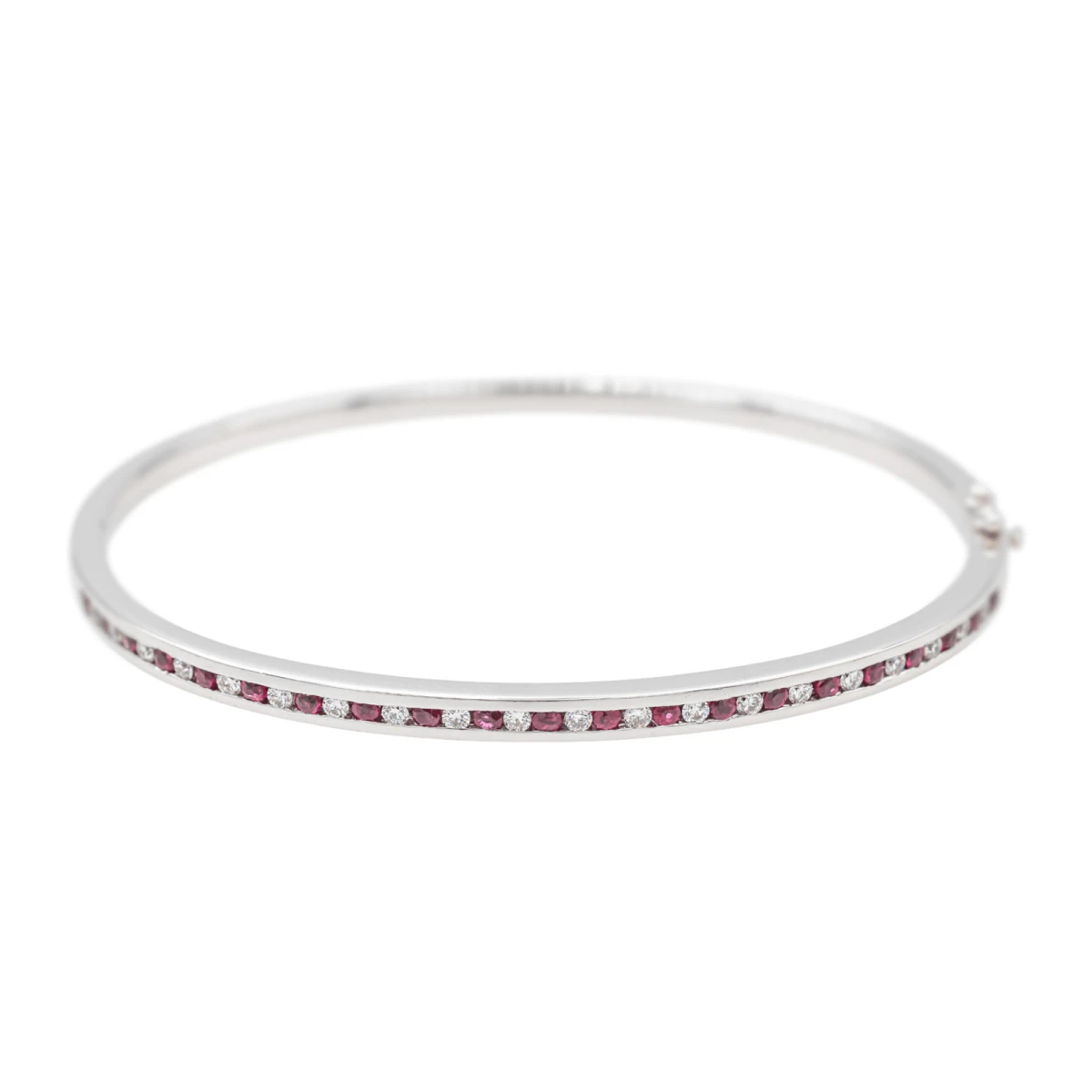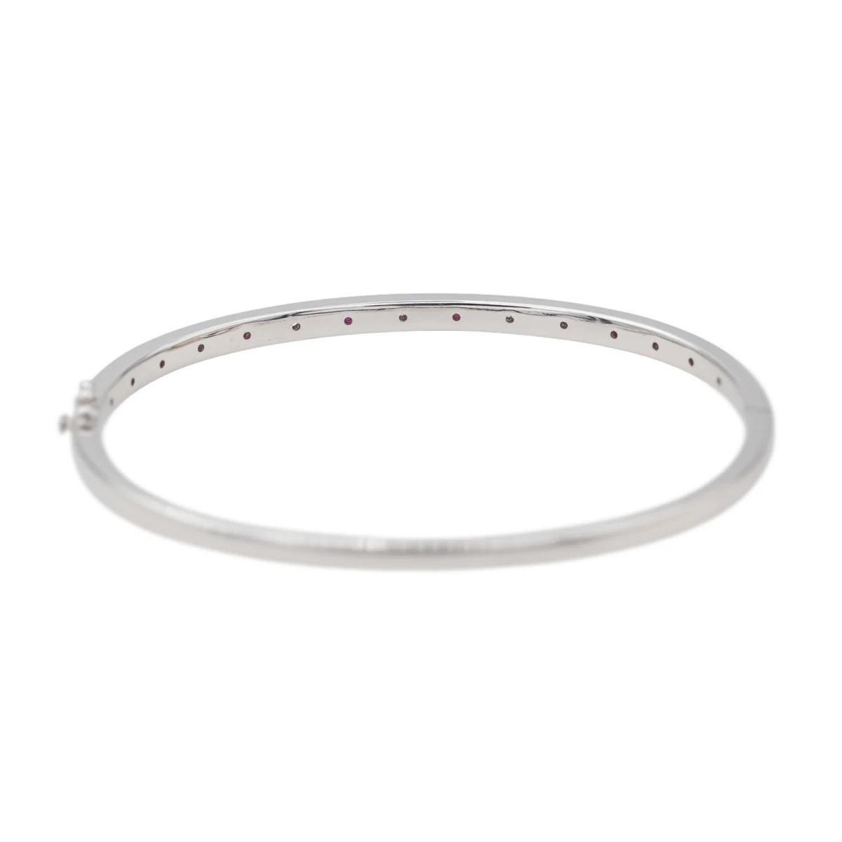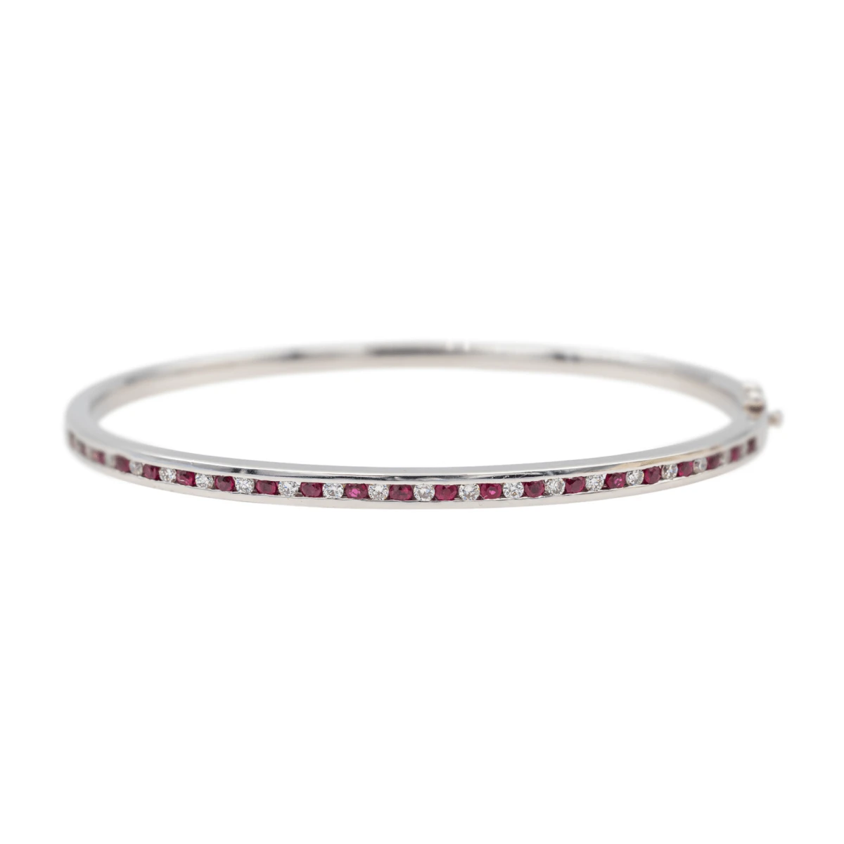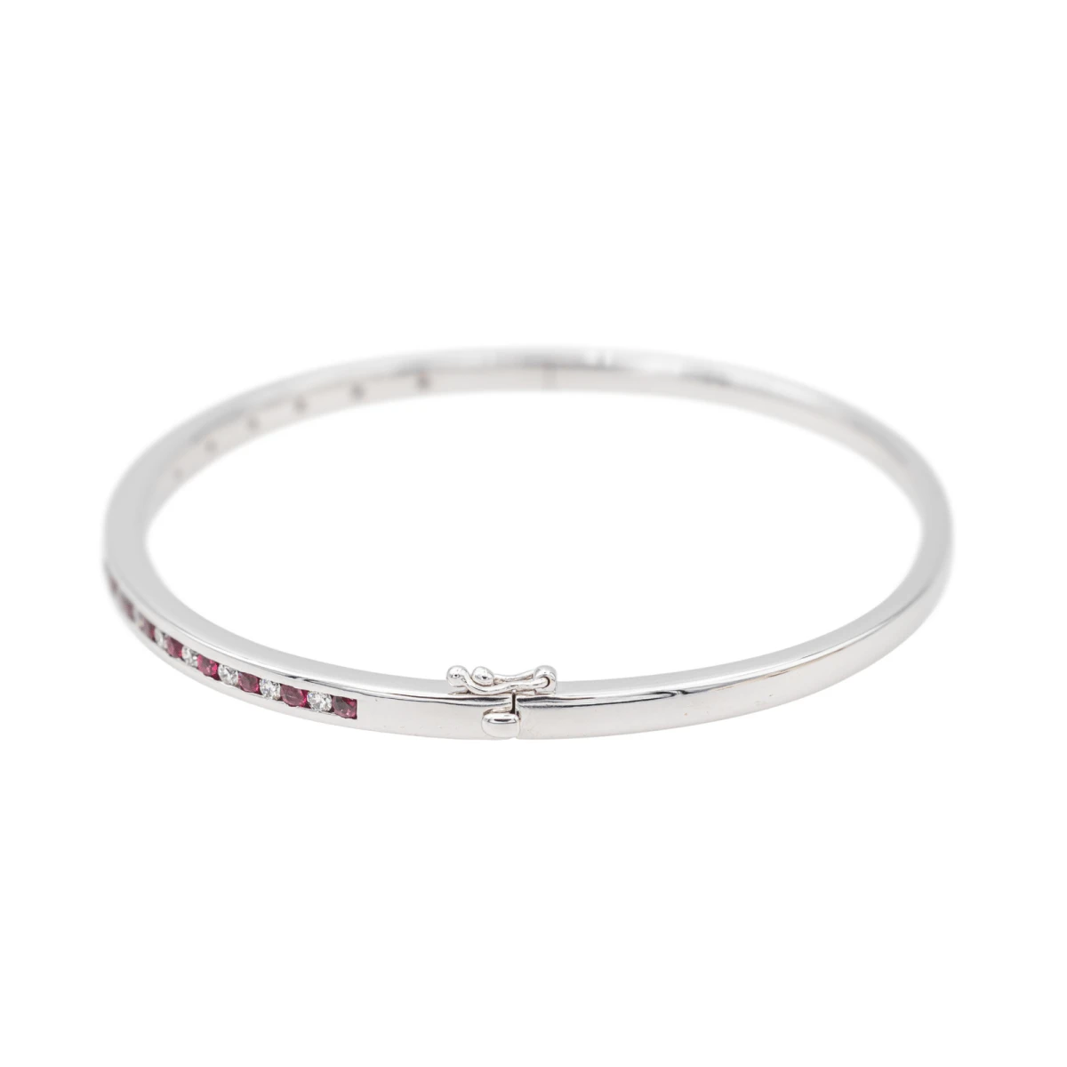 Bracelet jonc en or blanc 750 millièmes (18 carats). ouvrant. serti taille de rubis et de diamants. 20 rubis d’un poids total d’environ 0.63 ct. et 20 diamants taille brillant. d’un poids total d’environ 0.50 ct. diamètre intérieur : 5.90 cm x 5.31 cm. largeur : 0.32 cm. tour de poignet : 18.50 cm. poids total : 14.09 g. fermoir languette avec un huit de sécurité. poinçon hibou. excellent état