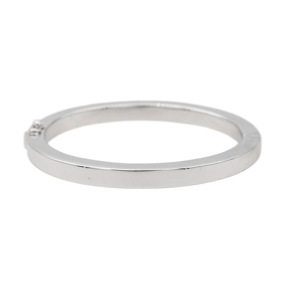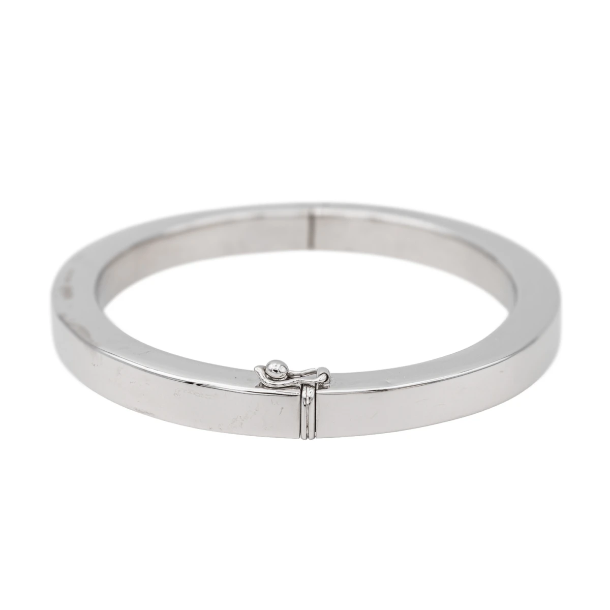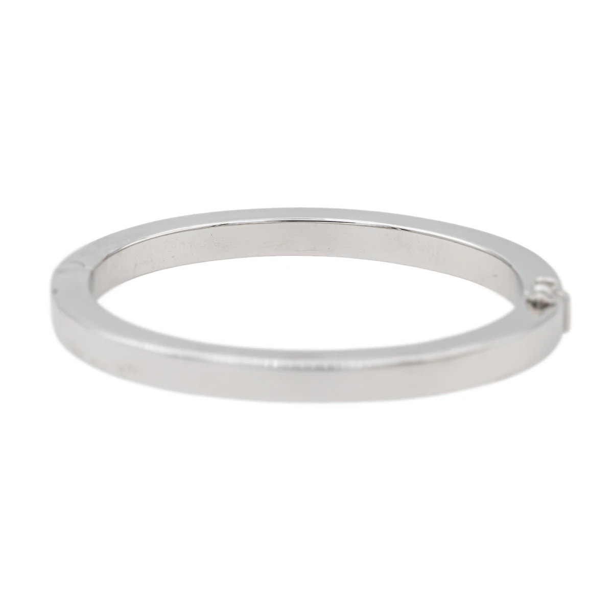 Bracelet jonc en or blanc 750 millièmes (18 carats). (ouvrant). diamètre intérieur : 5.04 cm x 5.98 cm. largeur : 0.60 cm. tour de poignet : 17 cm. poids total : 22.52 g. fermoir avec huit de sécurité. poinçon tête d’aigle. bon état