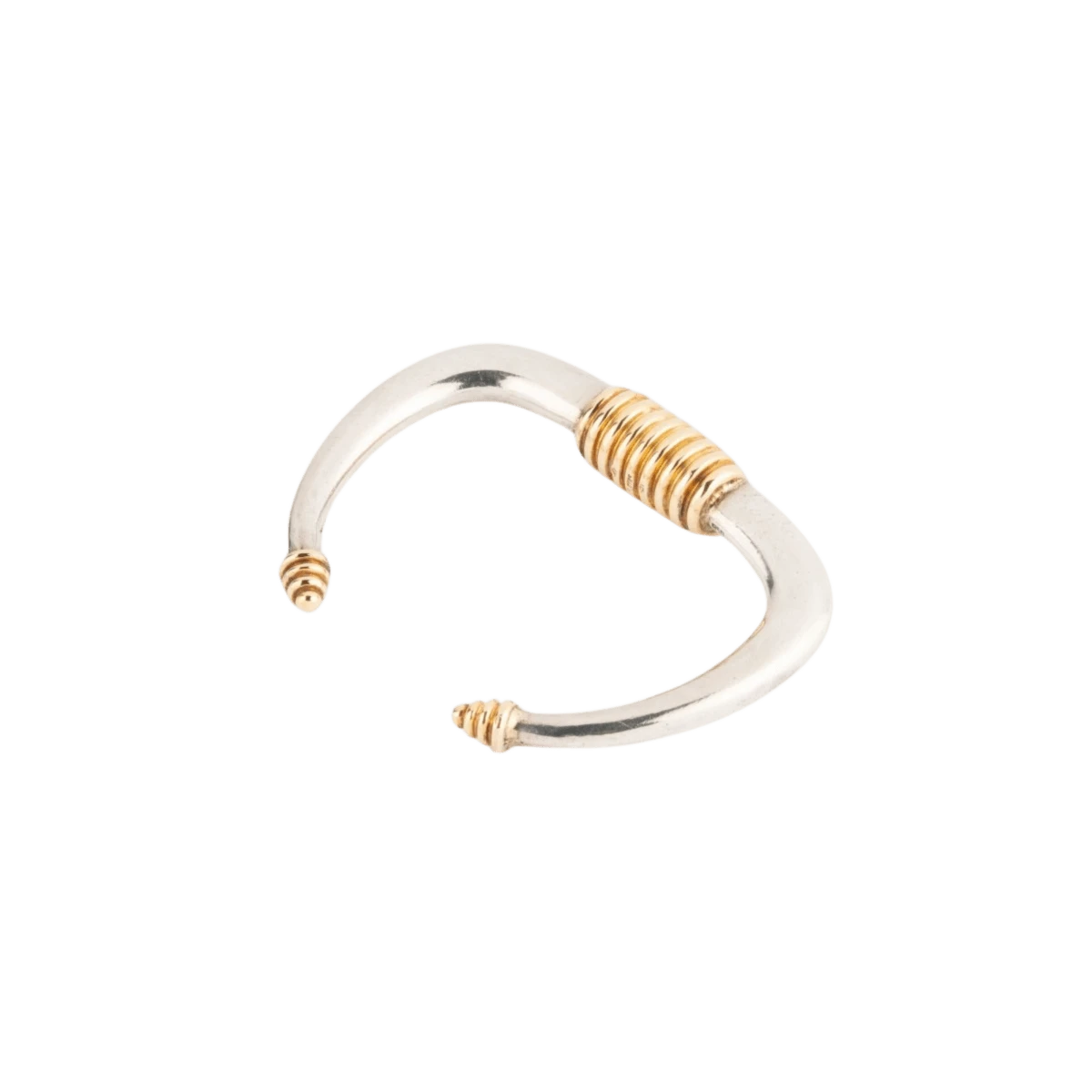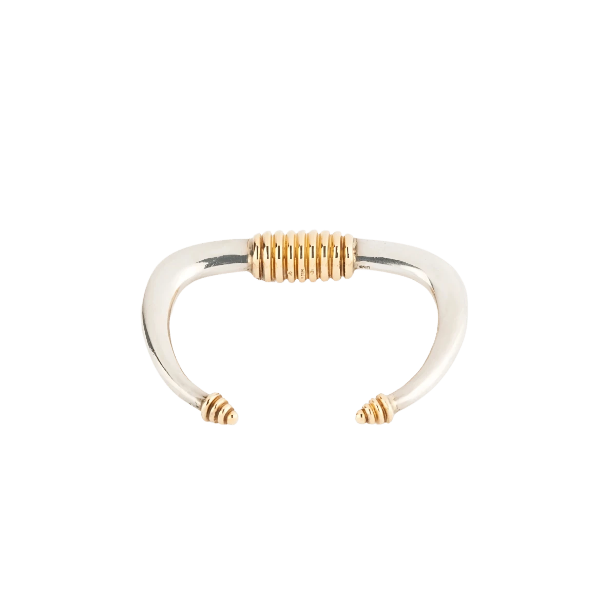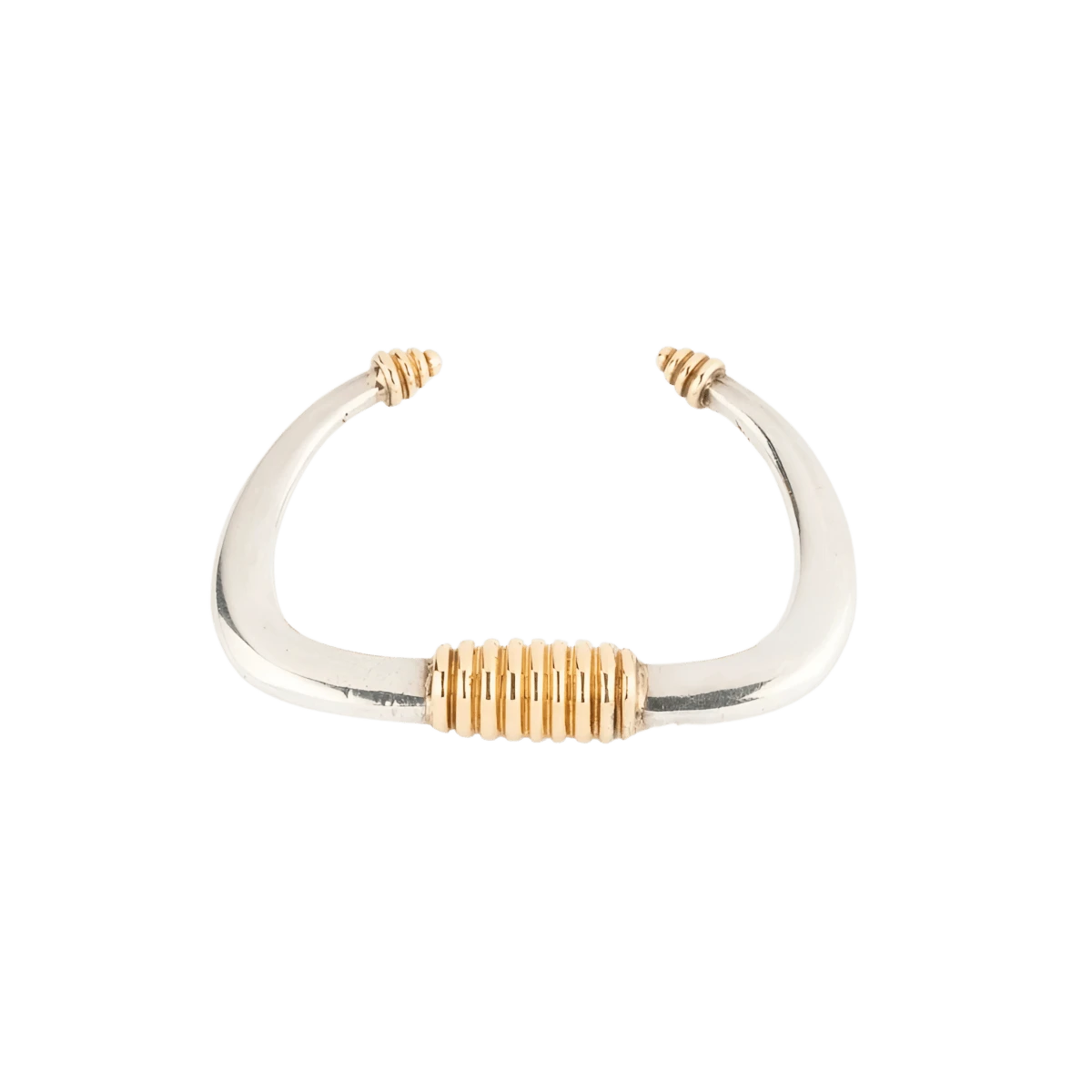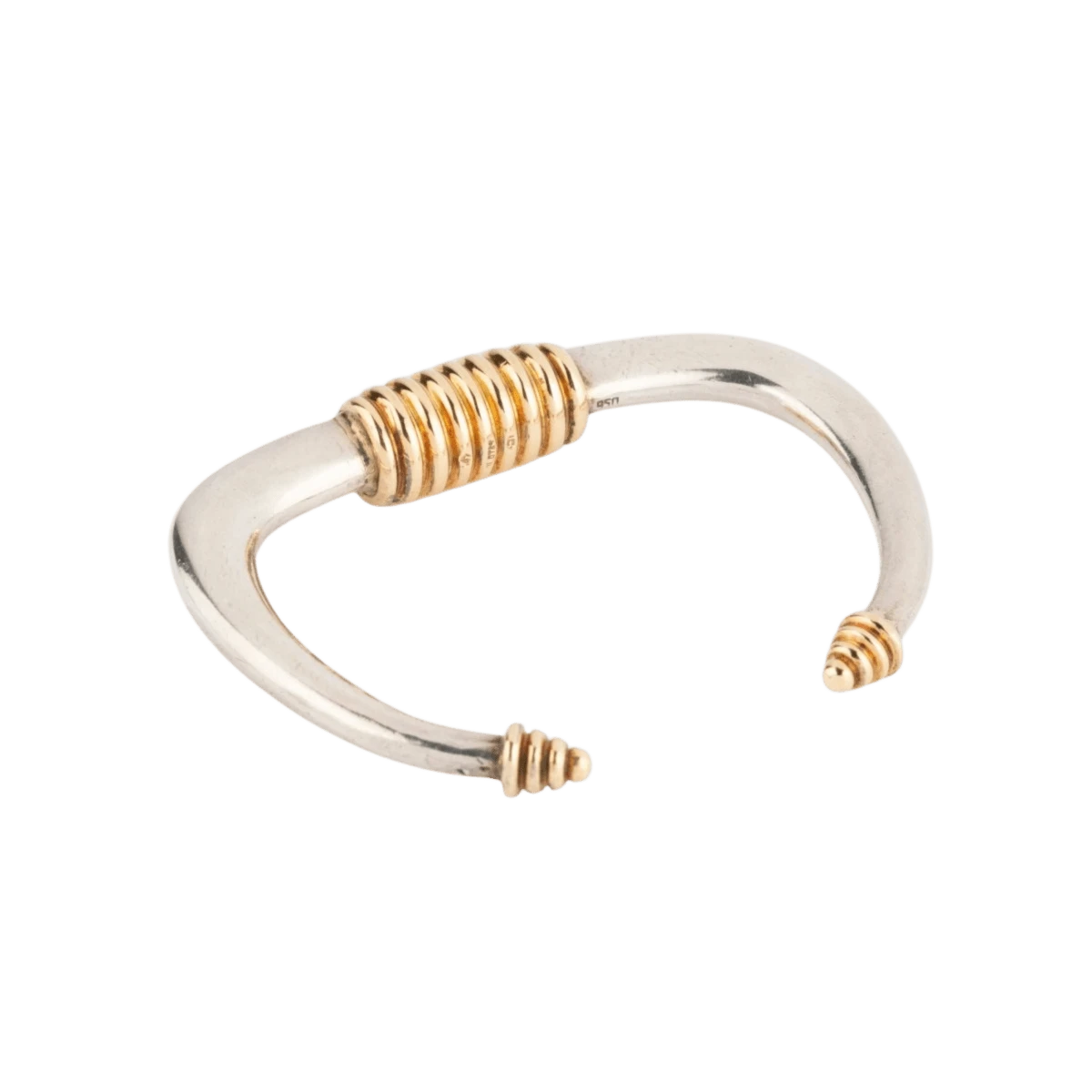 Bracelet rigide ouvert en argent et or jaune de la maison ZOLOTAS. Conçu en 18 carats, ce bracelet vintage présente un design élégant et intemporel. Fabriqué vers 1970, ce bijou unique ajoutera une touche de sophistication à votre tenue. Poinçon : visible. En excellent état de conservation, ce bracelet est un véritable chef-d’œuvre de l’artisanat.