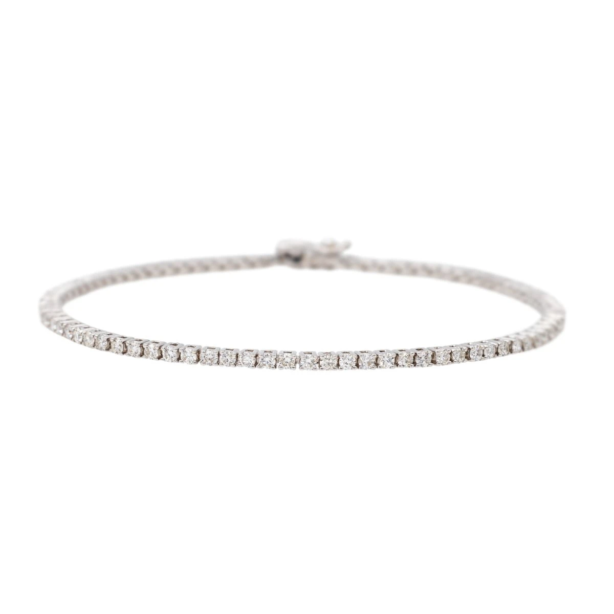 Bracelet ligne diamants. en or blanc 750 millièmes (18 carats). serti de 83 diamants. taille brillant. environ G/SI. pour un total d’environ 2.49 cts. longeur : 18 cm. largeur : 0.2 cm. huit de sécurité. poids total :7.38 g. poinçon hibou. excellent état
