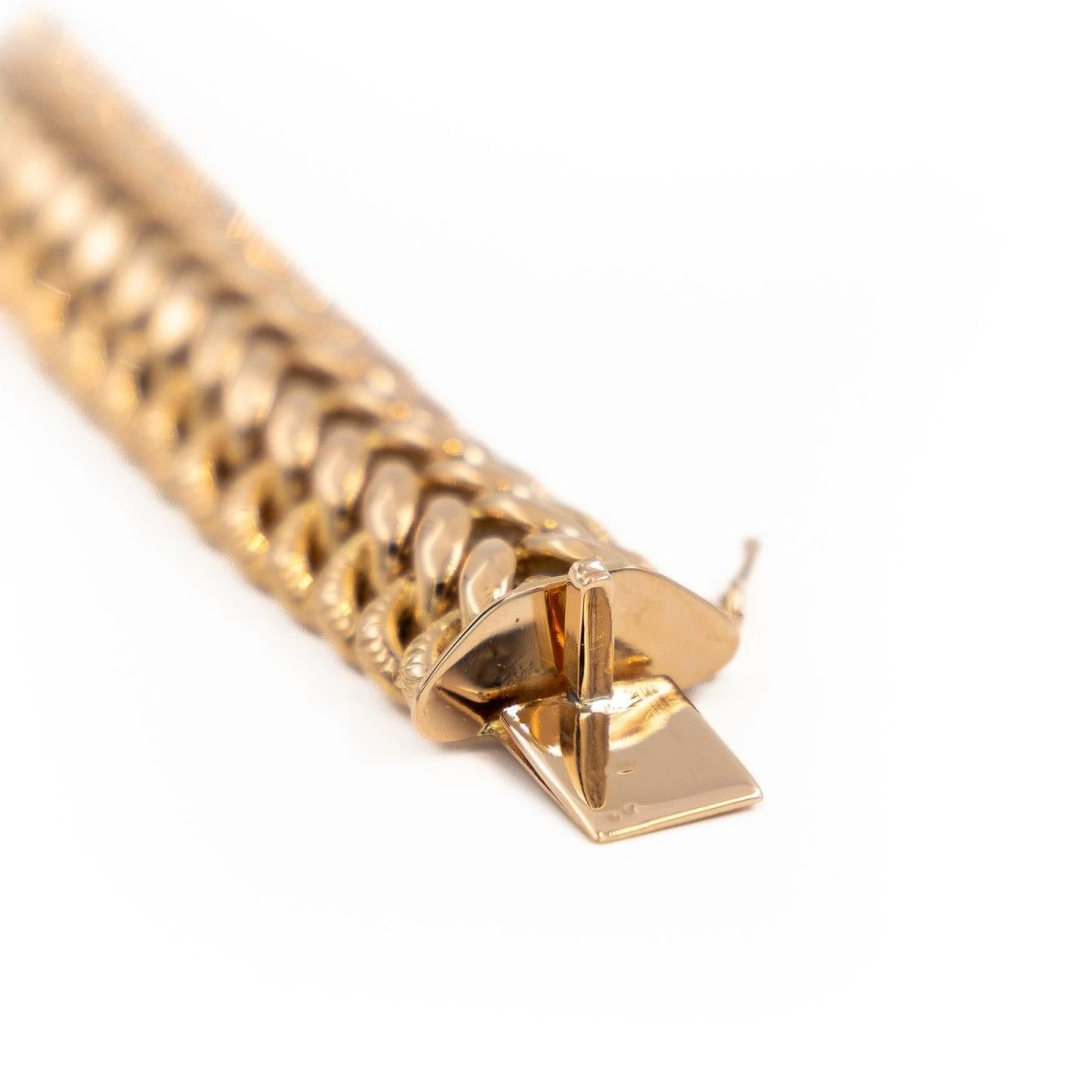 Bracelet Maille américaine. en or rose 750 millièmes (18 carats). Tour de poignet: 17 cm. Largeur: 2 cm. Poids total: 43.42 g. Poinçon tête d’aigle. Excellent état