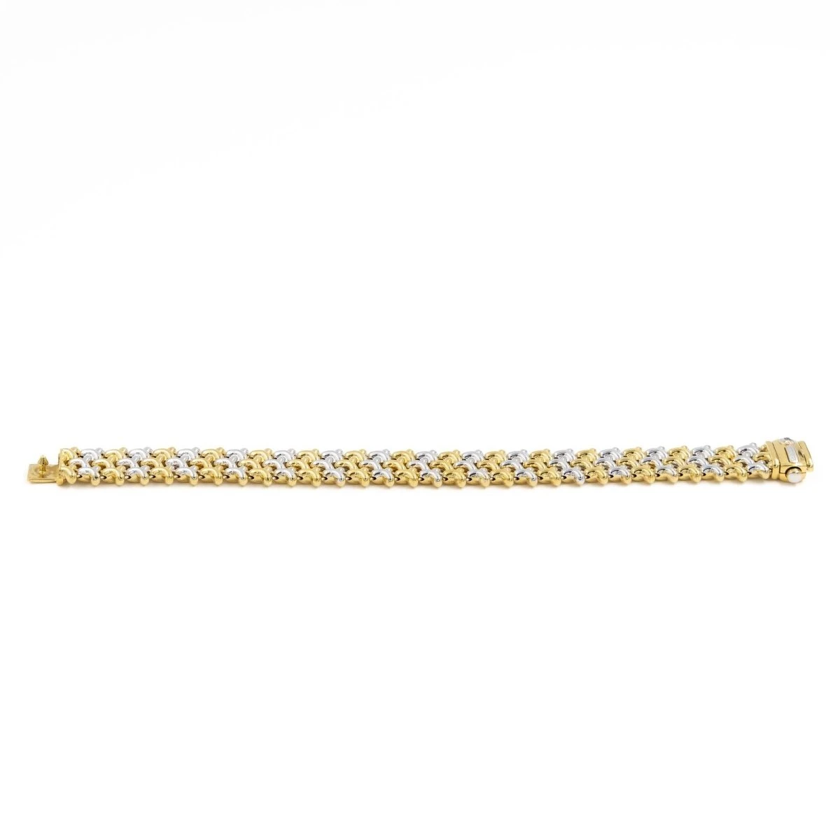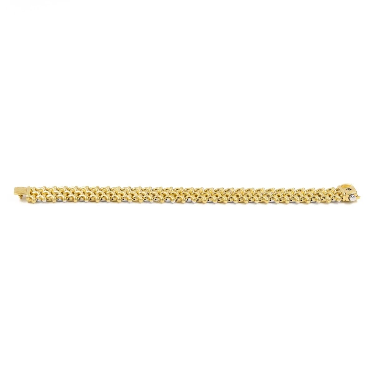 Bracelet signé de la maison Chimento en or jaune et or blanc 750 millièmes (18 carats). Maille fantaisie. sertie d’un diamant de taille brillant d’environ 0.01 ct. Longueur: 19 cm. Largeur: 1.5 cm. Poids total: 27.03 g. Poinçon tête d’aigle. Excellent état