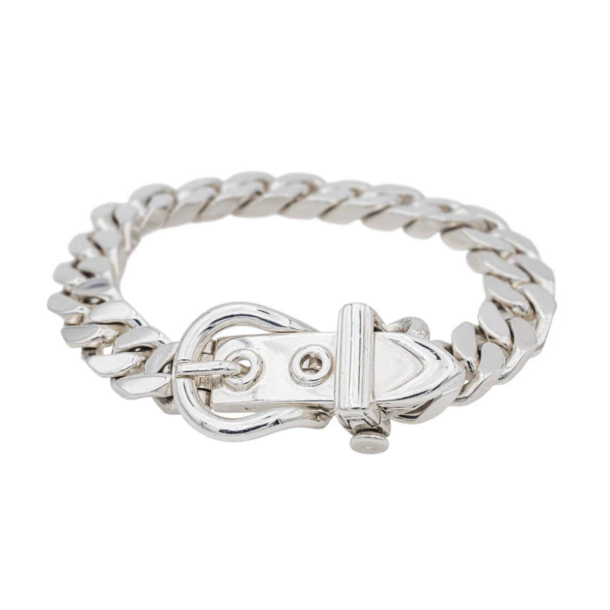 Bracelet signé de la Maison Hermès en argent 925 millièmes. modèle ceinture. maille gourmette. longueur : 21 cm. largeur : 0.87 cm. épaisseur : 0.3 cm. poids total : 42.29 g. (vendu avec écrin d’origine et d’époque). poinçon maître Gaetan Perçin. excellent état