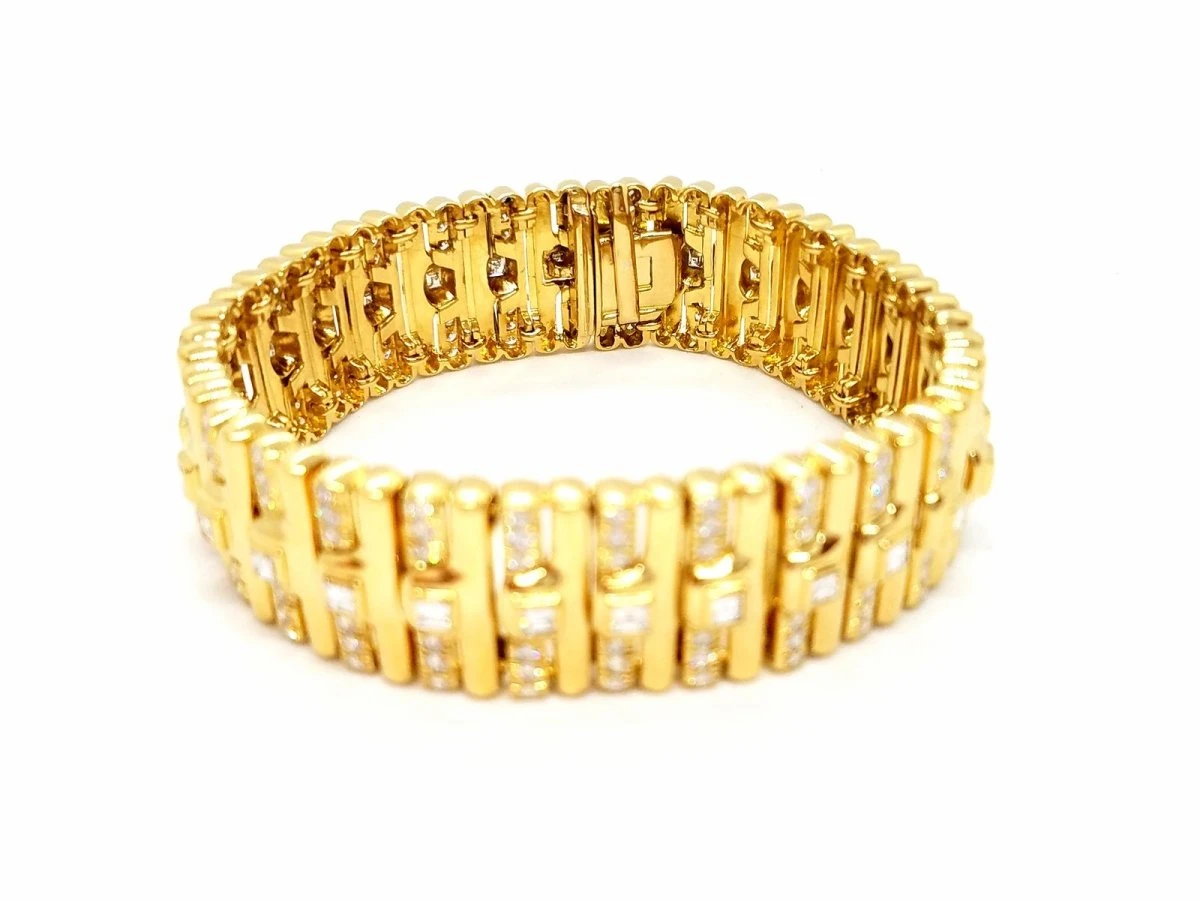 Magnifique bracelet en or jaune 750 millièmes (18 carats). articulé. serti au total d’environ 3.36 carats de diamants. 168 diamants taille brillant pour environ 1.68 ct au total et 28 diamants taille princesse pour environ 1.68 ct au total. poids total diamants: environ 3.36 carats. longueur: 16.5 cm. largeur: 1.7 cm. épaisseur: 0.44 cm. poids total: 62.72 g. poinçonné. excellent état