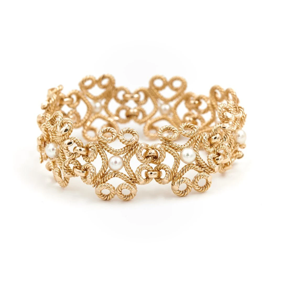 Bracelet en or jaune 750 millièmes (18 carats). Fil torsadé représentant des fleurs sertie de 8 perles de culture (environ 5 mm de diamètre). Tour de poignet : 19 cm. Largeur des motifs: 2.5 cm. fermoir avec huit de sécurité. Poids total: 43.12 g. Poinçon hibou. Excellent état