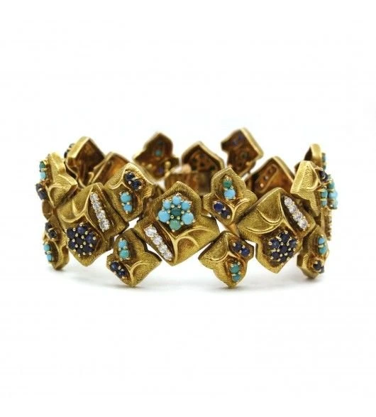 Magnifique bracelet articulé en or jaune 750. sertie de 60 saphirs et 60 turquoises et de 32 diamants.