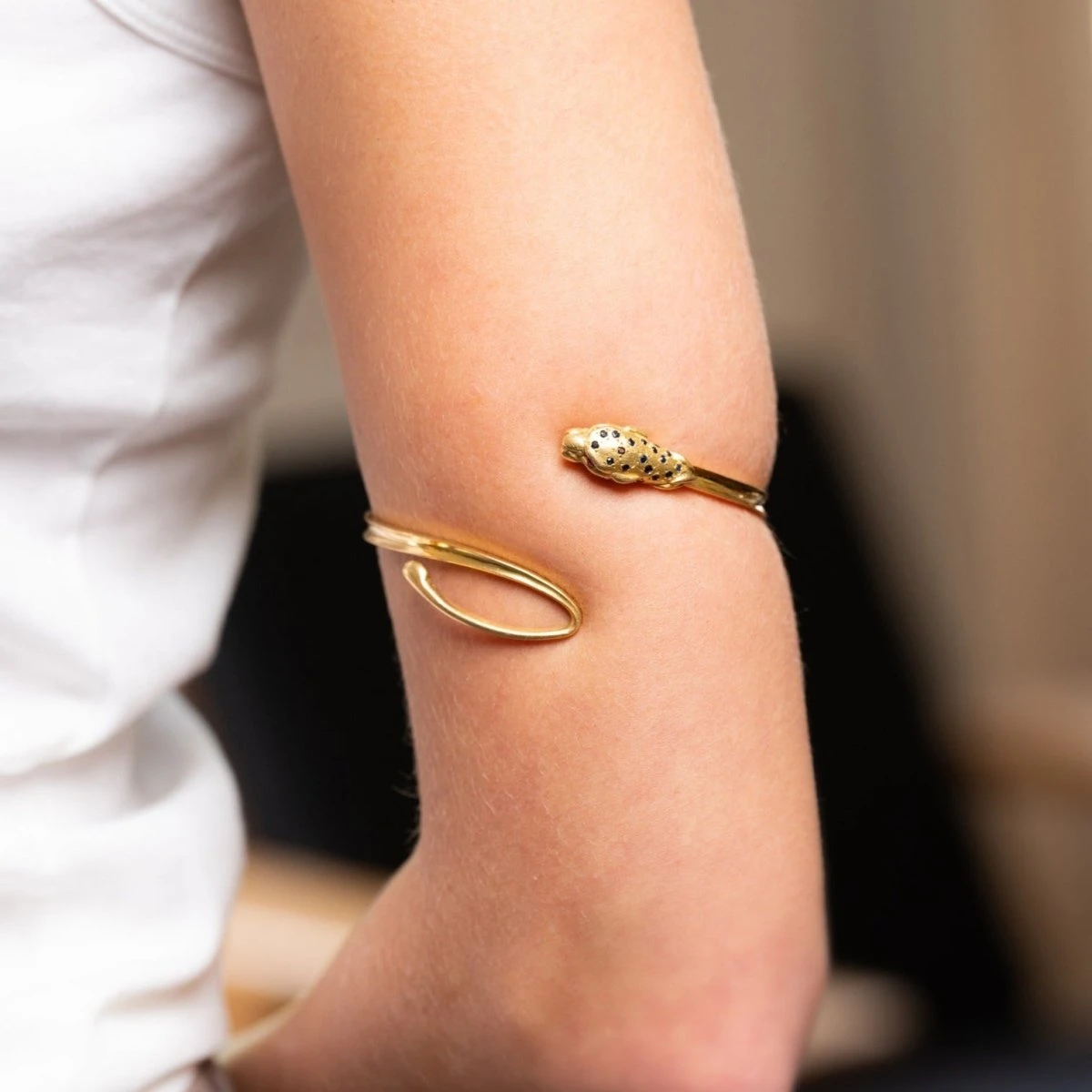 Bracelet jonc ouvrant en or jaune 18 carats, l’extrémité figurant une tête de panthère.