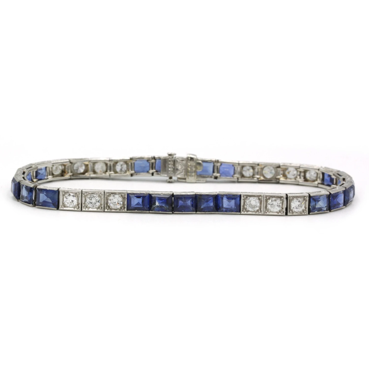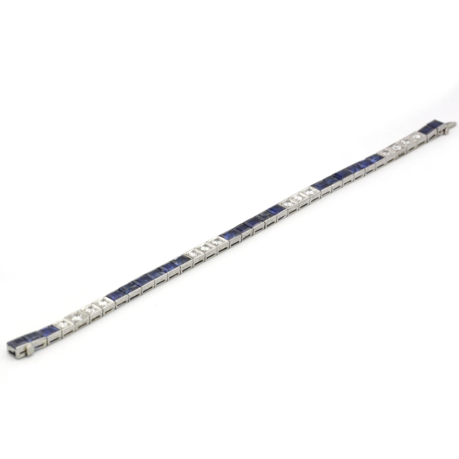 Bracelet Art Déco en platine 850‰, sertie de 14 diamants demi-taille (2 carats environs), qualité G-H/VS et de 22 saphirs naturels calibrés (9 carats environs). Loquet de sécurité.