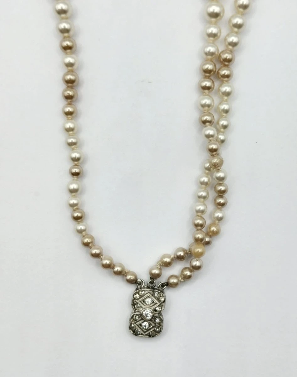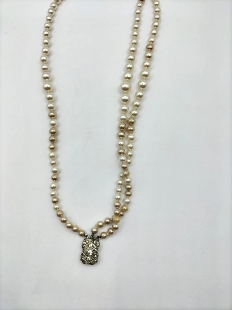 Bracelet de trois rangs de perles en chute, fermoir en argent orné de brillants. Certaines perles sont de couleur beige