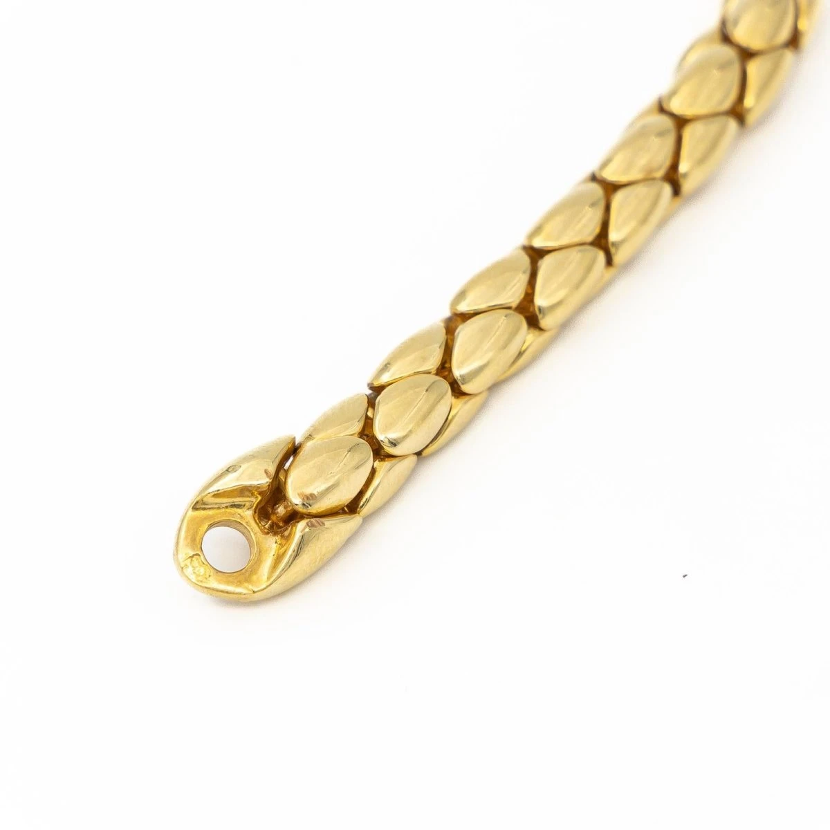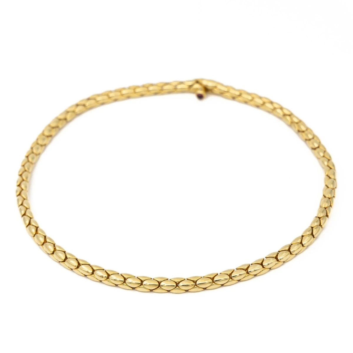 Chaine en or jaune 750 millièmes (18 carats). maille grain de riz. ferrmoir serti d’un cabochon rubis. longueur: 41.5 cm. poids total: 44.88g. poinçon tête d’aigle. excellent état