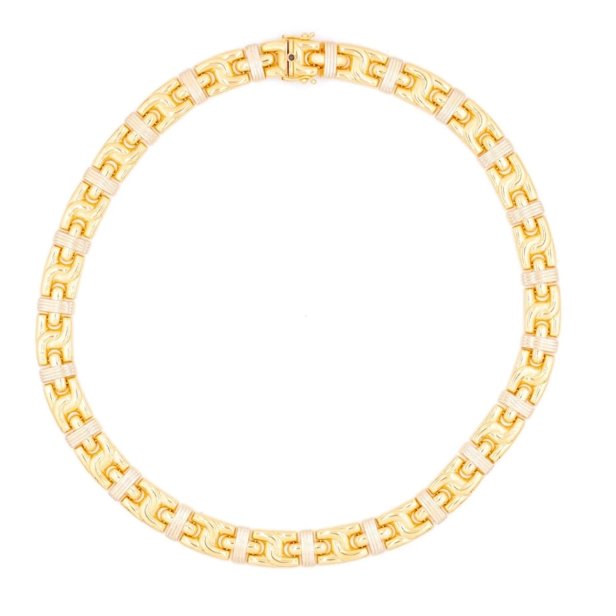 Collier signé de la maison Caplain Saint André. en or jaune 750 millièmes (18 carats). maille souple articulée. fermoir serti d’un saphir en cabochon d’environ 0.02 ct. longueur: 45 cm. largeur: 1.1 cm. fermoir avec deux huit de sécurité. poids total: 49.33 g. poinçon tête d’aigle. excellent état