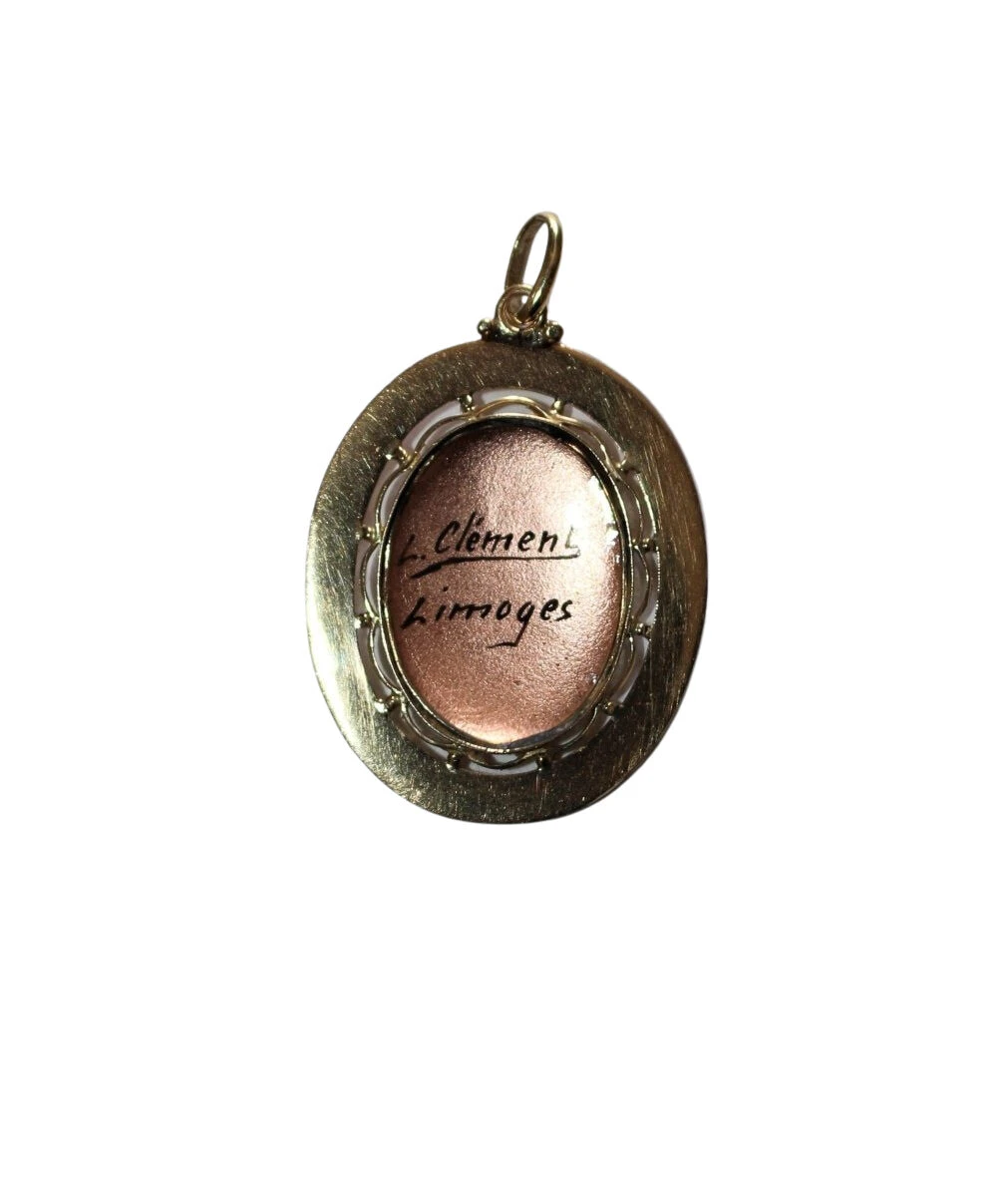 Collier Médaille en pendentif en or jaune 18 carats représentant une femme de profil en émaux de Limoges sur fond rouge.