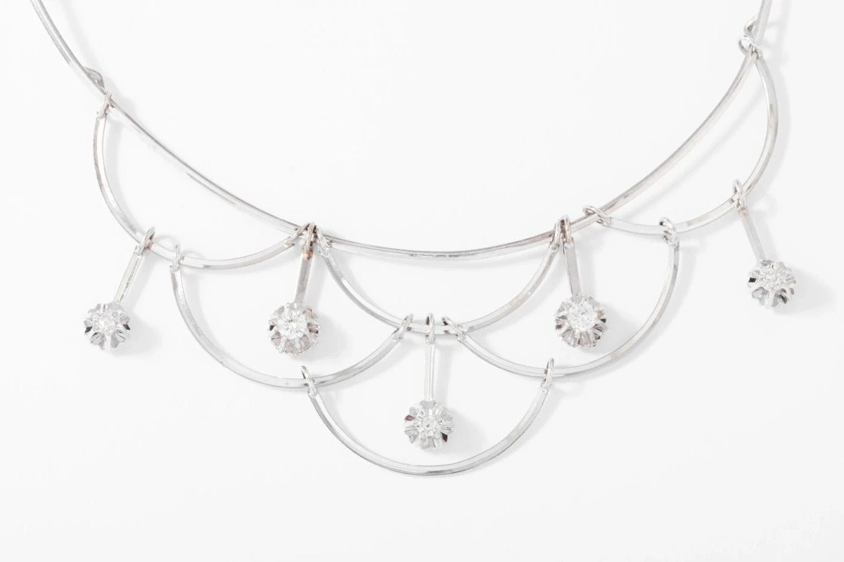 Collier en or gris et diamant datant des années 1960, joliment orné de demi lune en or, chaque cercle est orné de diamant.