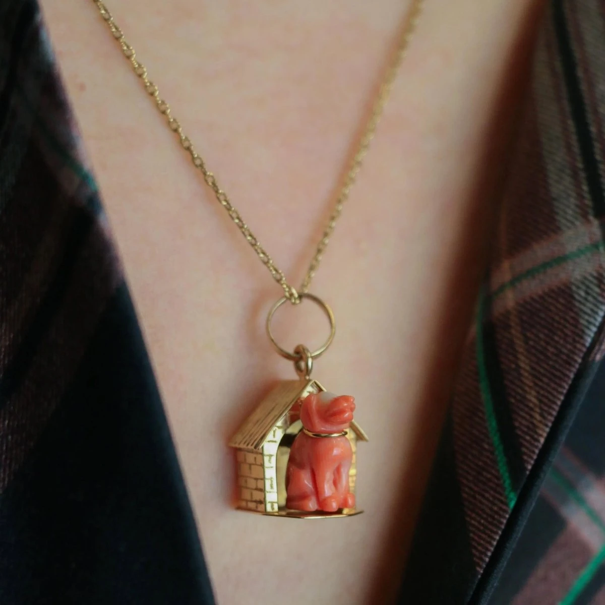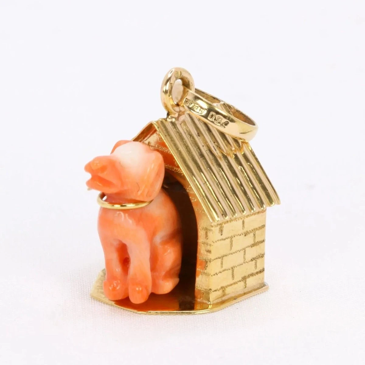 Pendentif Charms en or jaune 18 carats figurant une niche et son chien en corail. Travail italien des années 1970. Présence du poinçon charançon pour l’or 18 carats et du poinçon de fabricant italien. Hauteur bélière comprise : 2,9 cm. Largeur : 1,6 cm.