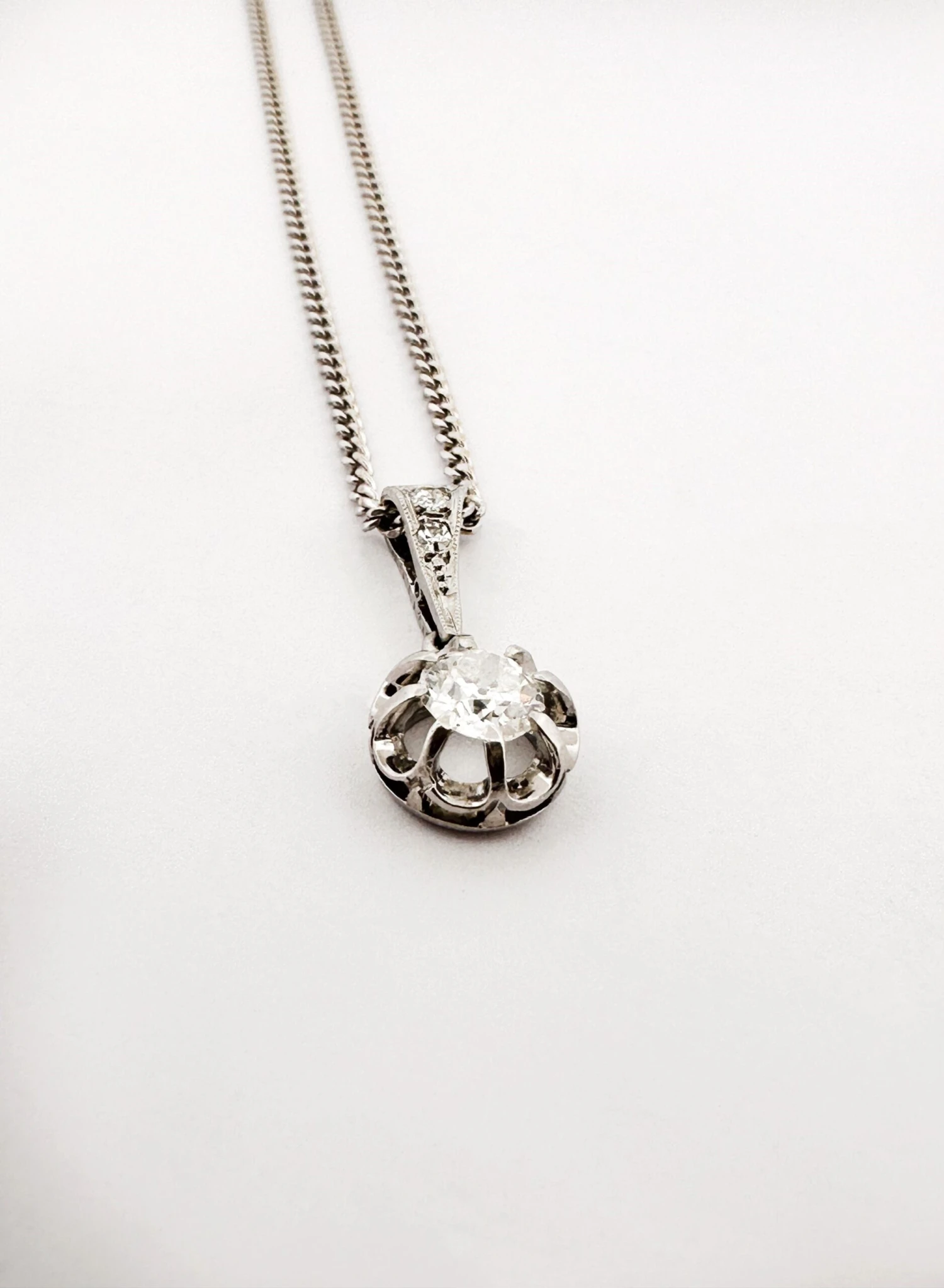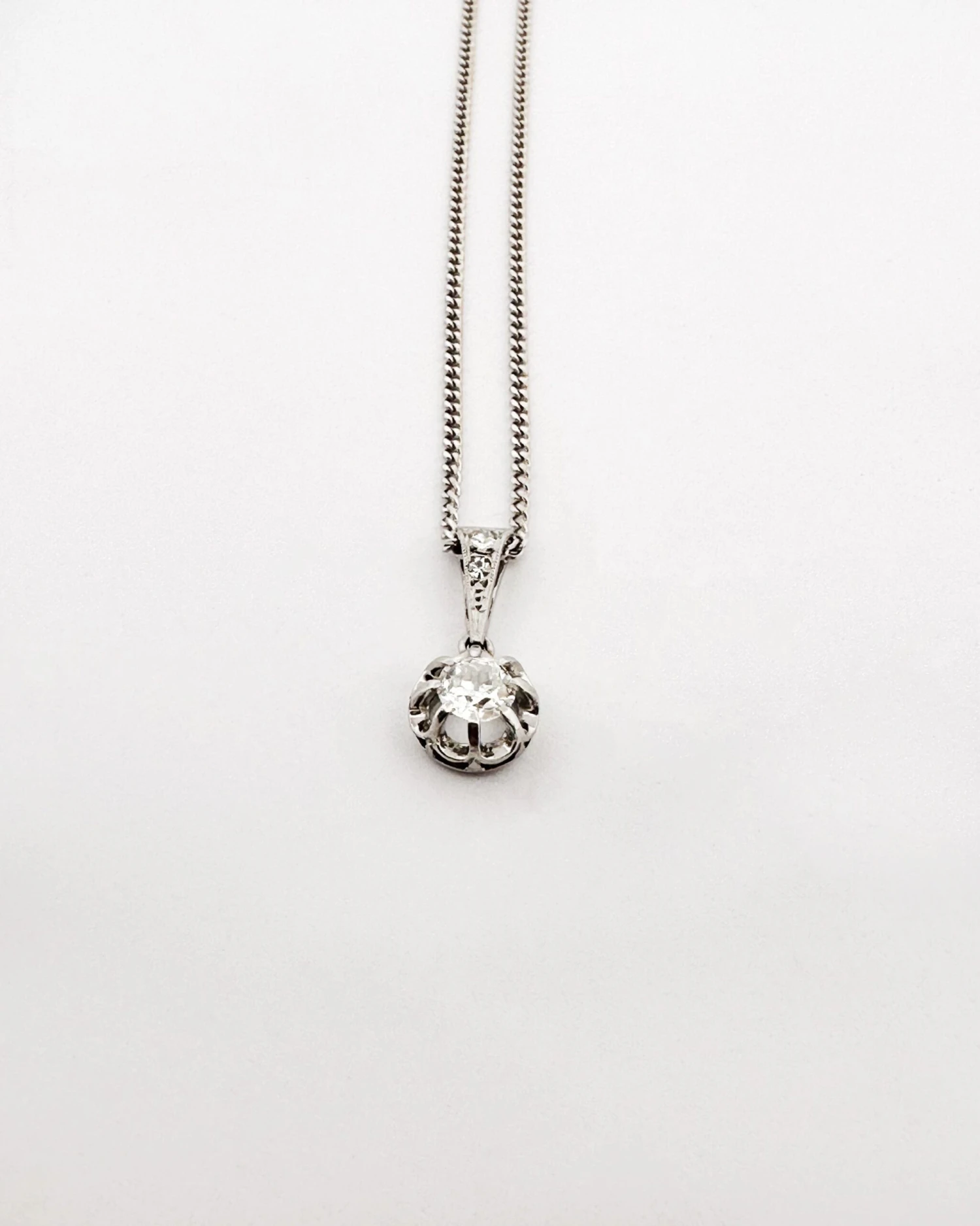 Collier maille gourmette en or blanc 18K (750/1000) orné d’un pendentif serti de diamants, le principal calibrant 0,25 ct environ.