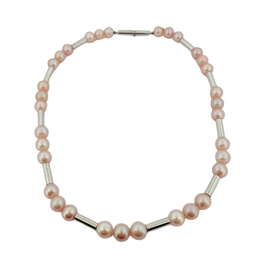 Collier POIRAY « fuseau » en or blanc 18 carats et perles roses. Numéroté.