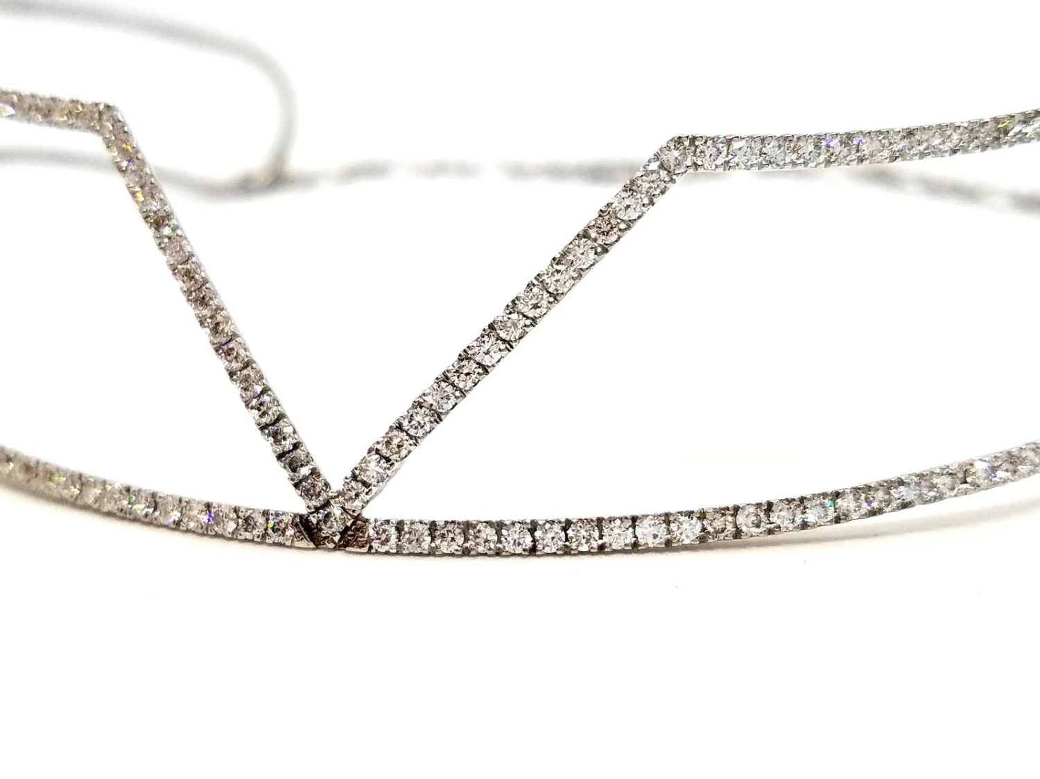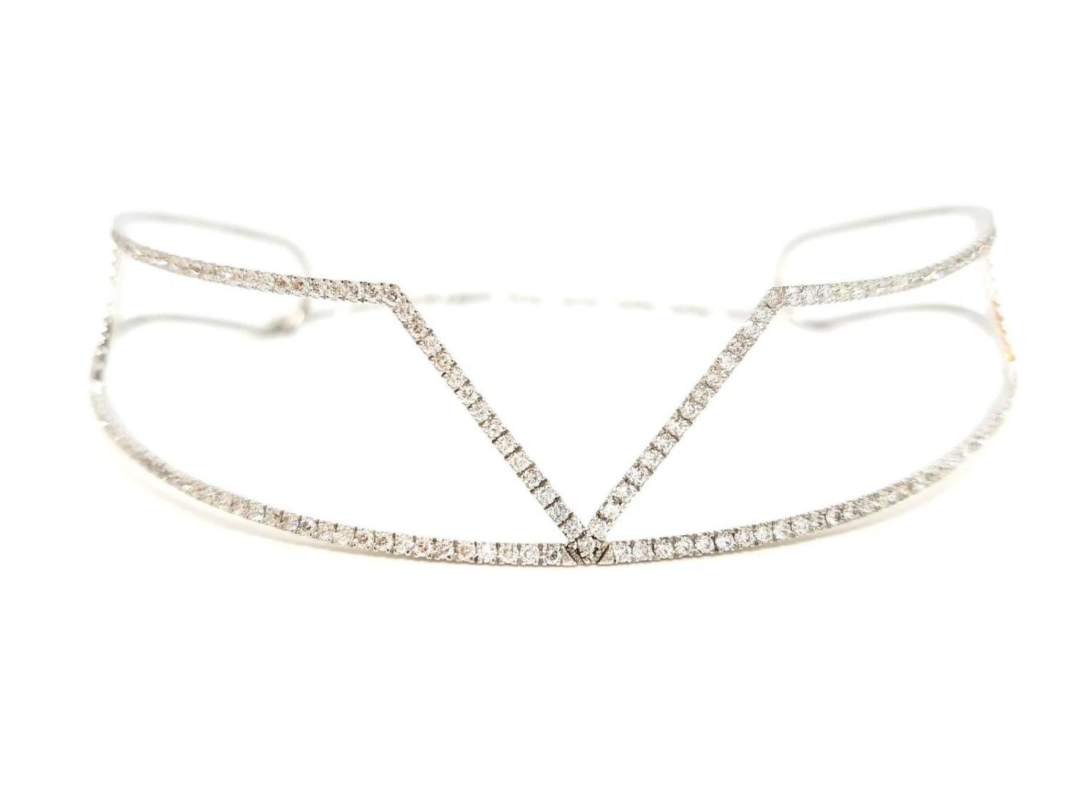 Magnifique collier de haute joaillerie. modèle graphique en or blanc 750 millièmes (18 carats). ras de cou. serti de 255 diamants taille brillant F-VS pour 3.83 carats au total. taille ajustable grâce à la chaînette à l’arrière du collier jusqu’à 38 cm. largeur du motif: 2.1 cm. largeur des lignes pavées de diamants: 0.16 cm. poids total: 20.80 g. poinçon tête d’aigle. état neuf. prix neuf: 12000€