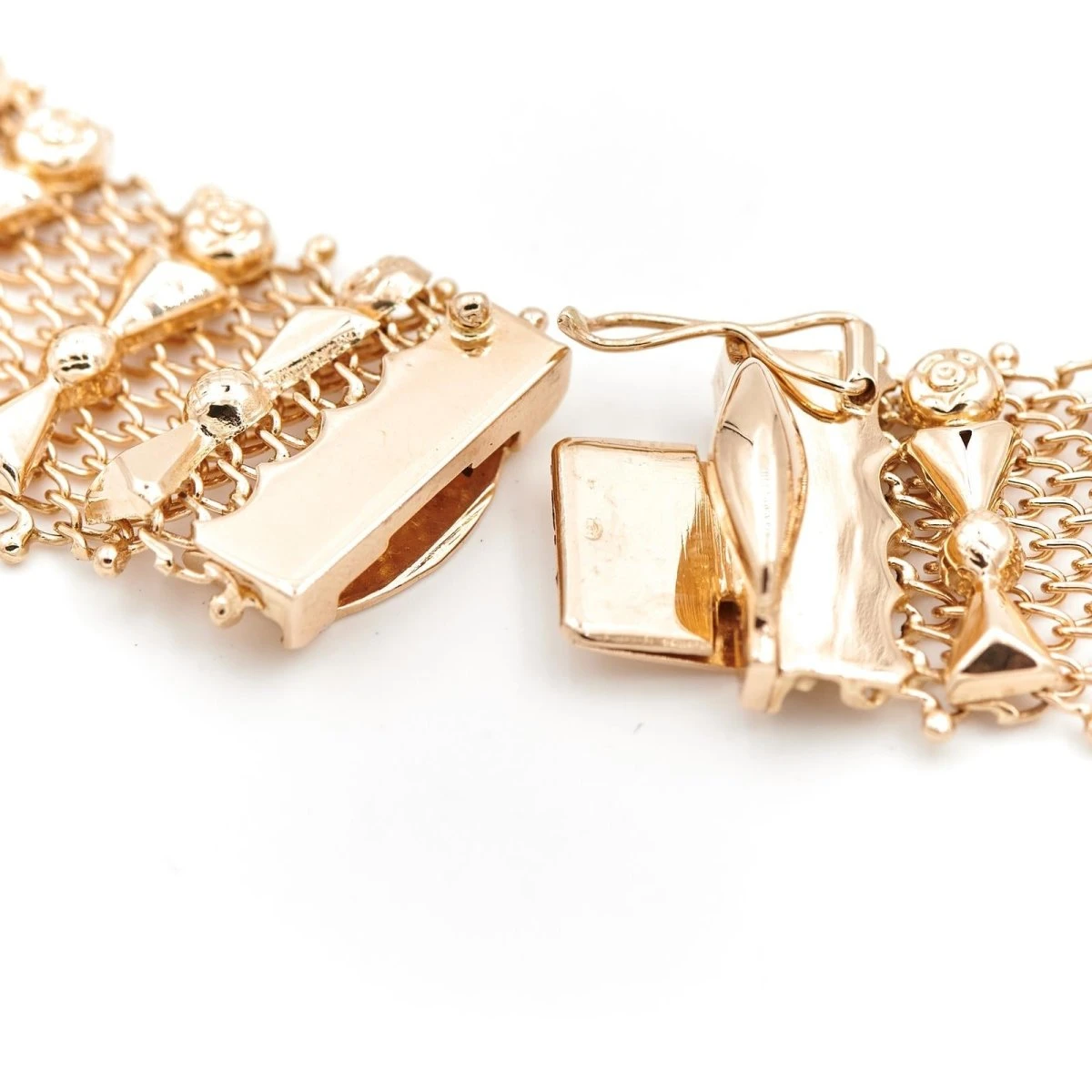 Collier en or jaune 750 millièmes (18 carats). maille fine décorée de roses à l’une des extrémités sur la longueur. fermoir avec un huit de sécurité. poids total : 55.10 g. longueur 41.5 cm. largeur 1.7 cm. poinçon hibou. excellent état