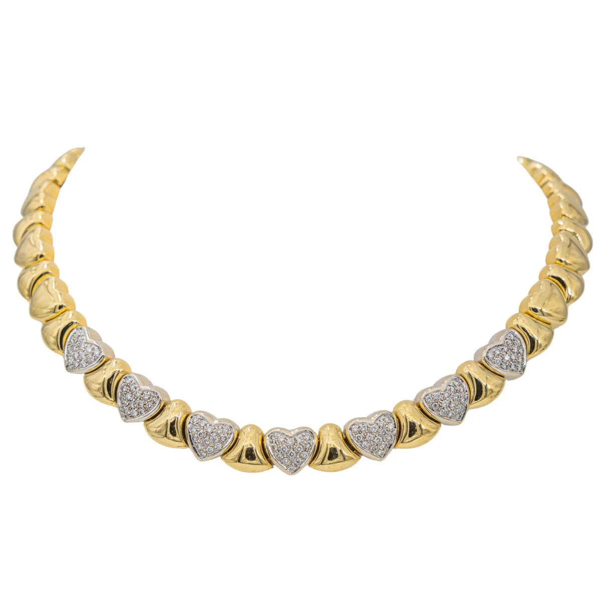 Collier en or jaune et or blanc 750 millièmes (18 carats). arborant des motifs cœurs. dont 7 sont sertis de 15 diamants chacun. taille brillant. 0.01 ct chacun. Poids total estimé des diamants: 1.05 ct. Tour de cou: 43.00 cm. Largeur : 1.00 cm. fermoir languette avec huit de sécurité. Poids total: 99.06 g. Poinçon hibou. Excellent état
