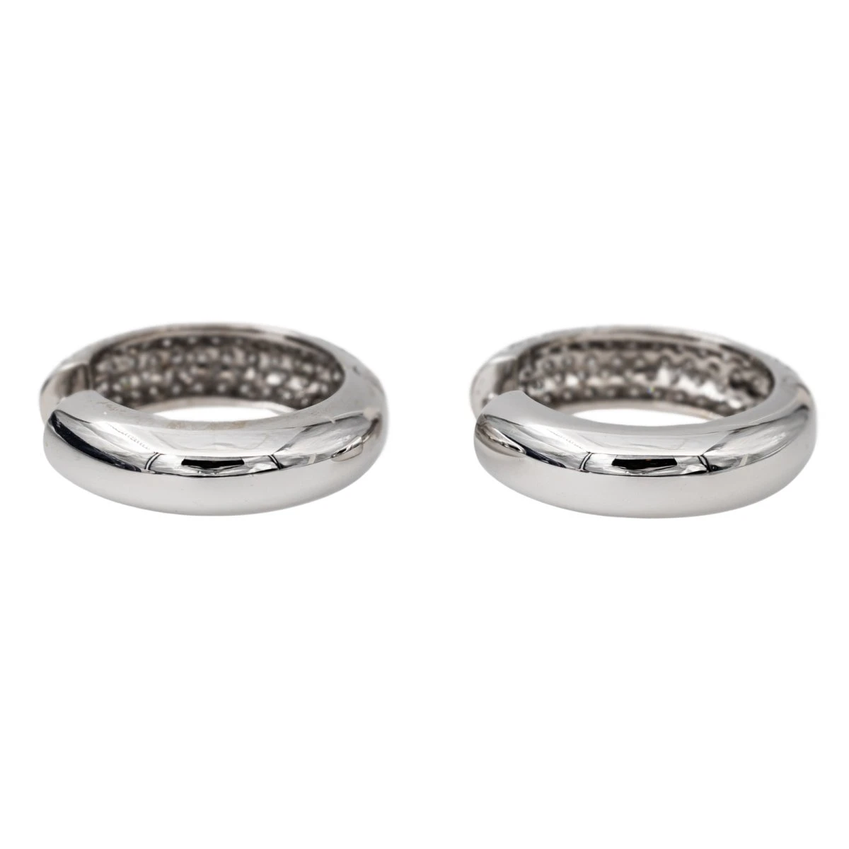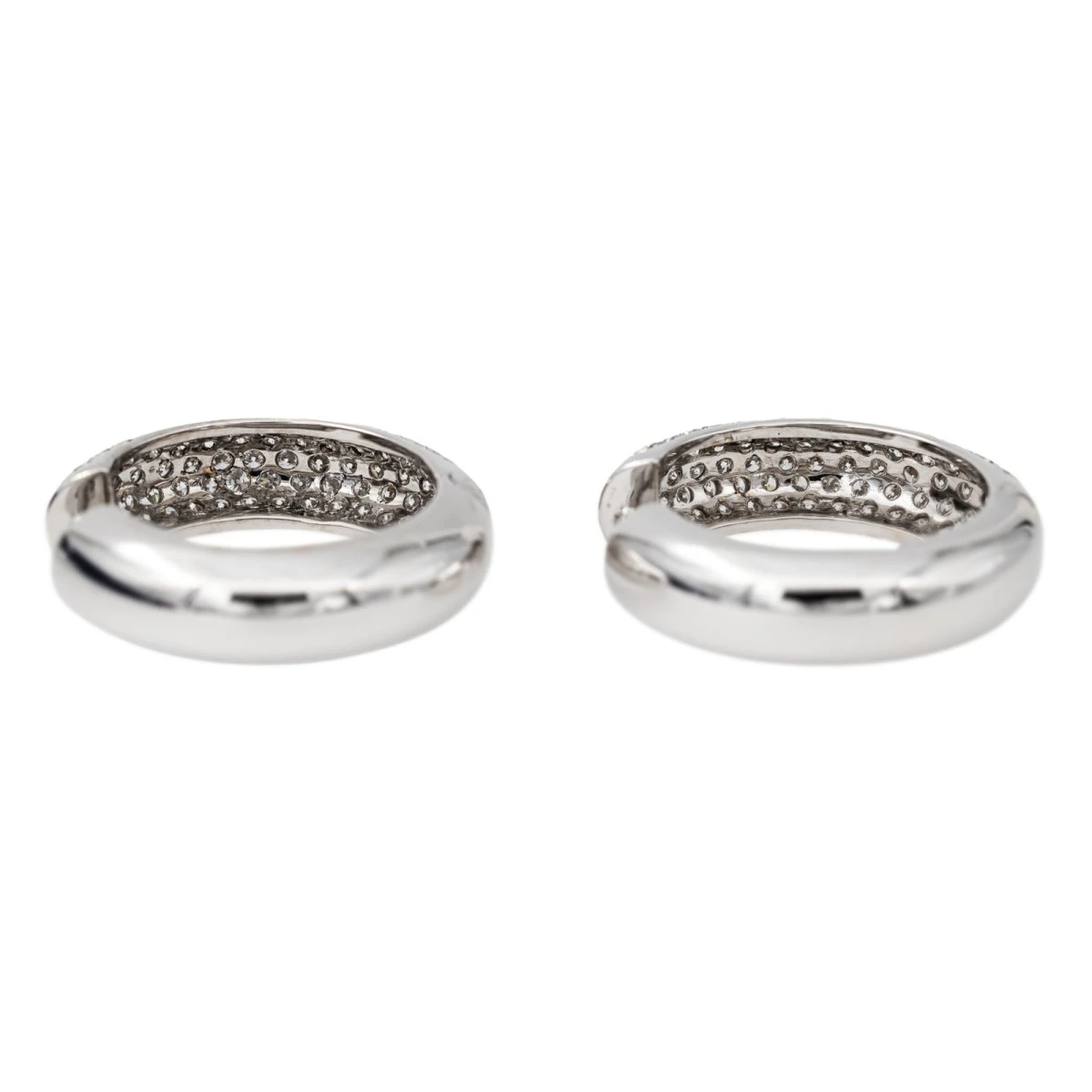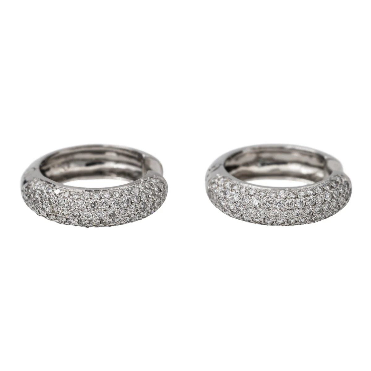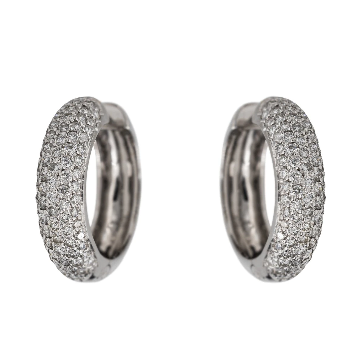 Créoles en or blanc 750 millièmes (18 carats). serties de 158 diamants taille brillant. chacun d’un poids d’environ 0.02 ct. poids total des diamants: 3.16 cts. longueur: 2.58 cm. largeur: 0.72 cm. poids total: 15.55 g. poinçon hibou. excellent état