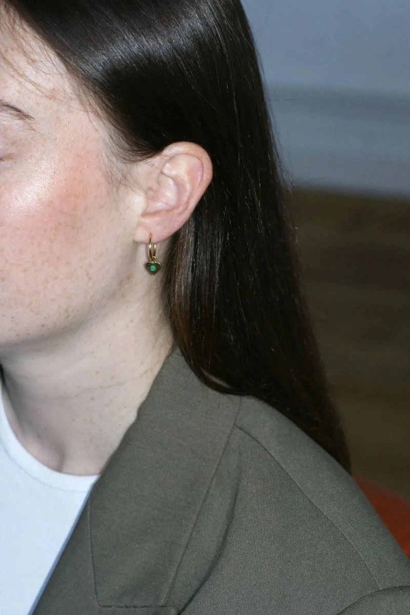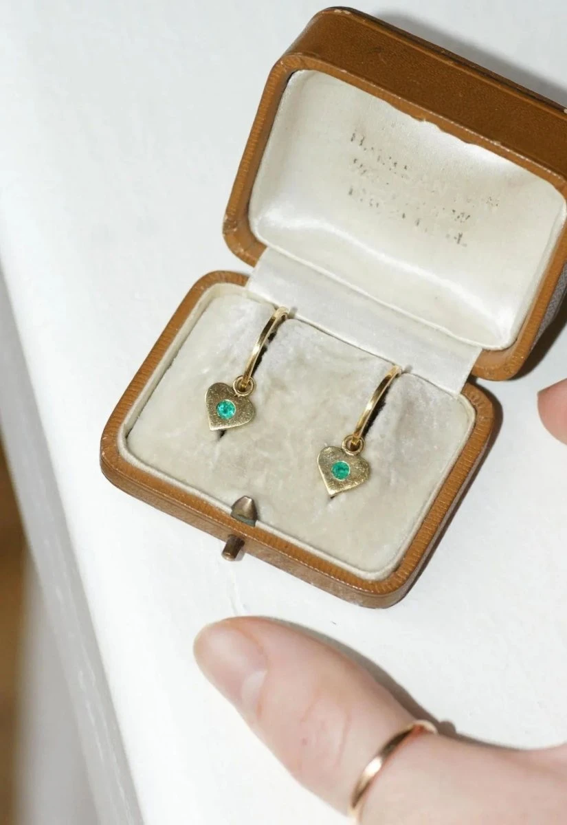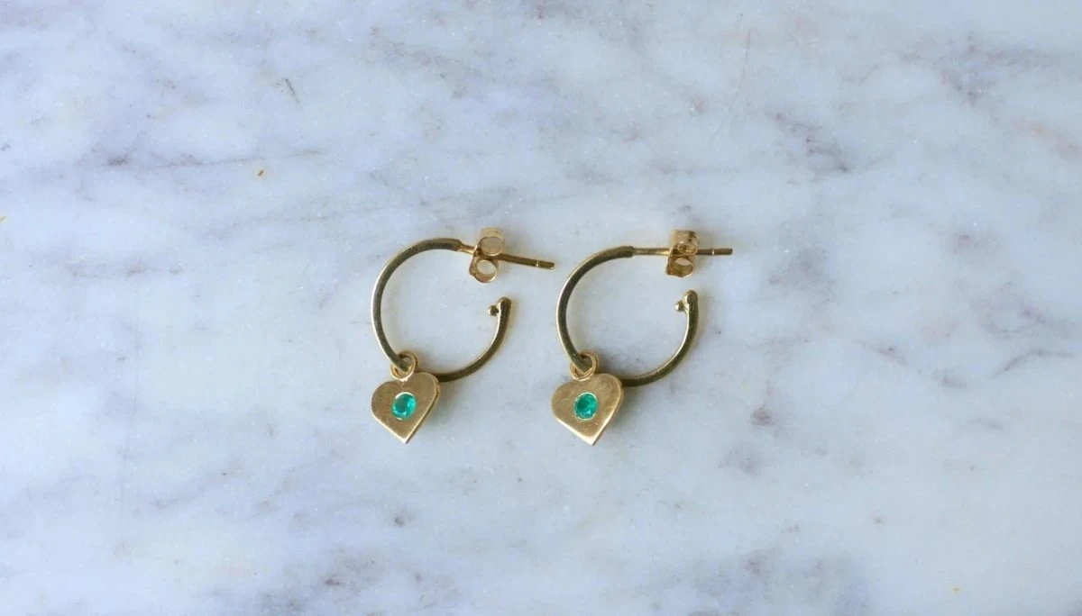 Créoles fil carré en or jaune 18kt(poinçon : hibou), ornées d’un pendant amovible en forme de coeur, serti d’émeraudes rondes (origine probable: Colombie) dont le poids total est estimé à environ 0.15 Ct.